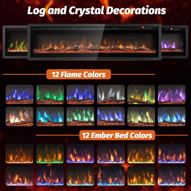Adapting to any interior design, this fireplace heater offers wall-mounted modernity, recessed seamlessness, and freestanding flexibility. Create the perfect ambiance with 12 customizable flame and ember colors, adjustable brightness, and a choice of log or crystal decorations. All functions are controllable via a handy remote control with a 6 m range. Customize your heating with 750W/1500W settings and a programmable 8-hour timer. The built-in thermostat ensures comfortable temperatures from 18℃ to 28℃. Safety is a top priority, with an automatic shut-off feature to prevent overheating.Note:Please keep the top and back 5 cm away from the wall or cabinet for ventilation. Multi-installation Options: Opt for a classic wall-mounted setup to save floor space and add a modern touch, consider a recessed installation for a seamless, built-in look that's sleek and unobtrusive, or choose a freestanding arrangement for easy placement and relocation throughout your home. Powerful Heating Performance: This electric fireplace provides 5000 BTU of heating, efficiently warming spaces up to 37 m². With adjustable heat settings from 750W for mild days to 1500W for colder ones, and a thermostat ranging from 18℃ to 28℃, it maintains optimal comfort for your space. Stunning Flame Effect: This fireplace heater offers 12 flame colors and 12 ember bed colors with 5 adjustable brightness settings for complete customization. Both realistic log and crystal decorations enhance visual appeal. Plus, the flame effect can be enjoyed independently of the heating function for year-round ambiance. 8H Timer and Overheat Protection: This linear fireplace features a 1H-8H timer that allows you to set suitable heating times in advance. Additionally, built-in overheat protection automatically shuts down the unit if it gets too hot, securing your safety and extending the life of your fireplace. Convenient Remote Control: This recessed fireplace includes a remote control, which offers an effective range of up to 6 m. From the comfort of your seat, you can adjust heat/temp settings, switch between flame and ember colors, or set the timer.