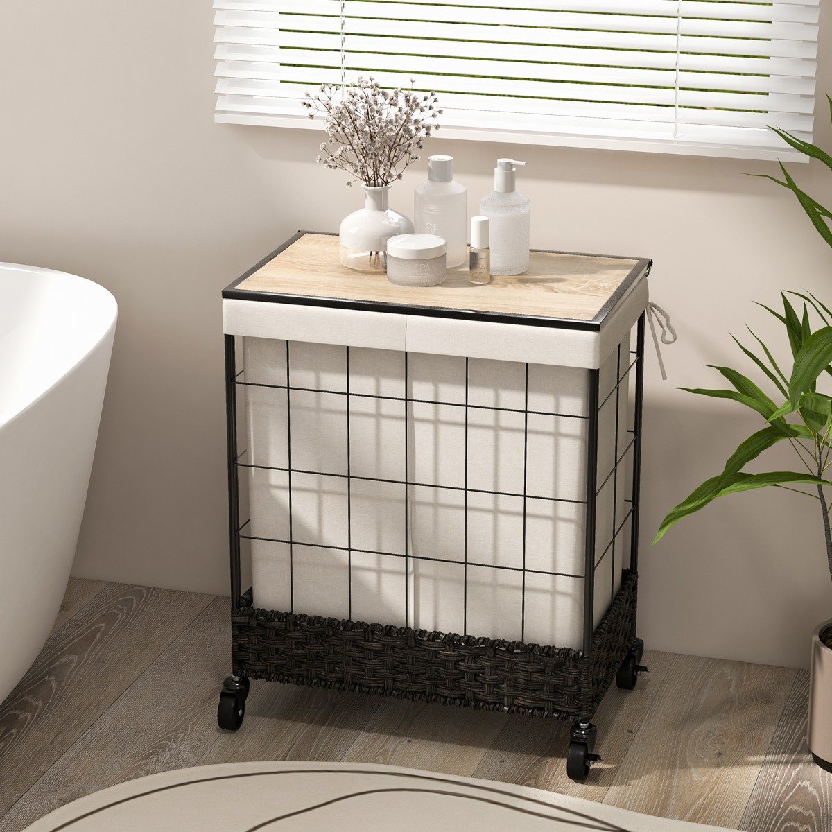 Experience ultimate convenience with our easy rolling hamper. Why choose our laundry hamper? Equipped with high mobility lockable universal wheels, this rolling hamper allows you to effortlessly transport your heavy dirty clothes. What’s more, our laundry hamper is crafted from powder coated premium metal for high durability and water resistance. In addition, the PP rattan weaving adds a touch of style to the hamper, while also providing long-lasting service. Moreover, keep your laundry organized and sorted with our 110L large capacity laundry bag. Featuring two separate pockets, this laundry bag allows you to quickly and efficiently separate your clothes. Designed with a sturdy MDF lid, our laundry hamper ensures easy access to your laundry. Upgrade your laundry experience with our easy rolling hamper. Convenient Rolling Hamper: Experience ultimate convenience with our easy rolling hamper. Equipped with high mobility lockable universal wheels, this rolling hamper allows you to effortlessly transport your heavy dirty clothes from room to room. Moreover, you can lock the cart in place for laundry organization, or unlock it for clothing transportation.Premium Material: Crafted with the high quality metal, our metal laundry cart features a powder coated metal frame, which ensuring durability and water resistance. In addition, the delicate PP rattan weaving not only provides elegance for your room, but also offers long-lasting service time.2-Sections Laundry Bag: Keep your laundry organized and sorted with our 110L large capacity laundry bag. Features 2 two separate pockets, this laundry bag allows you to quickly separate your light color and dark color clothes for efficient and convenient laundry days. What’s more, the 2 sturdy straps can secure the bag to the frame firmly, without worrying about dropping off.Convenient and Dust-Proof Lid: Our laundry hamper features a lightweight MDF lid that allows for easy access to your laundry while providing protection from dust. Moreover, the pet-proof simple cover can hold up to 20kg, allowing you to lay laundry detergent and other sundries on top.Easy Assembly and Cleaning: Each part of the hamper is already numbered in the guide book, and all the necessary accessories are included in the product, you can assemble the laundry cart in no time. Other than that, the easy-cleaning MDF board can be wiped easily with a damp towel.