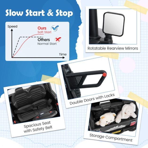 Allow kids to drive for fun with our 12V ride on truck car! In manual mode, kids can operate the jeep at 2 different speeds using the steering wheel and foot pedal. For added security, parents can use the remote control with 3 adjustable speeds. The 4-wheel suspension system ensures a smooth and stable ride across various terrains, making adventures limitless for little drivers. Comfort and safety are prioritized with a spacious seat, safety belt, and lockable doors, as well as a storage compartment for convenient storage. Entertainment features such as LED lights, music, and horn sounds keep children engaged for hours. With wireless connectivity, USB, and AUX ports, there are more options for entertainment. This 12V electric car is a perfect gift for boys and girls over 3 years old, creating lasting memories with its dual powerful motors and 12V rechargeable battery. Bullet Point: Available in 2 Control Modes: Your child can independently operate the ride-on truck using the steering wheel and foot pedal, or you can ensure their safety with the remote control. The kids manual mode operates at 2 different speeds, while the parent control mode features 3 adjustable speeds. 4-Wheel Suspension System: Boasting 4 wear-resistant wheels with spring suspensions and, the ride on car offers a smooth and stable ride across various terrains. Whether on grasslands, boardwalks, or more, this 12V electric car provides children with limitless adventures. Designed for Comfort and Safety: The kids electric vehicle prioritizes your child's comfort and safety with a spacious seat, safety belt, and 2 lockable doors. There is a storage compartment to keep toys and snacks handy. With slow start and stop functions, toddlers will not be scared by sudden acceleration or deceleration. Entertainment Never Ends: Built with LED lights, music, and horn sound, this ride on jeep toy keeps your child entertained for hours on end. Additionally, it offers versatile entertainment options with wireless connectivity, USB, and AUX ports, allowing for a variety of music and audio choices. Perfect Gift for Boys and Girls: Designed to spark imagination and adventure, the ride on truck will be a perfect present for boys and girls aged 3 years old and above. The dual strong motors and a 12V rechargeable battery will encourage joyful playtimes and fun lasting memories.