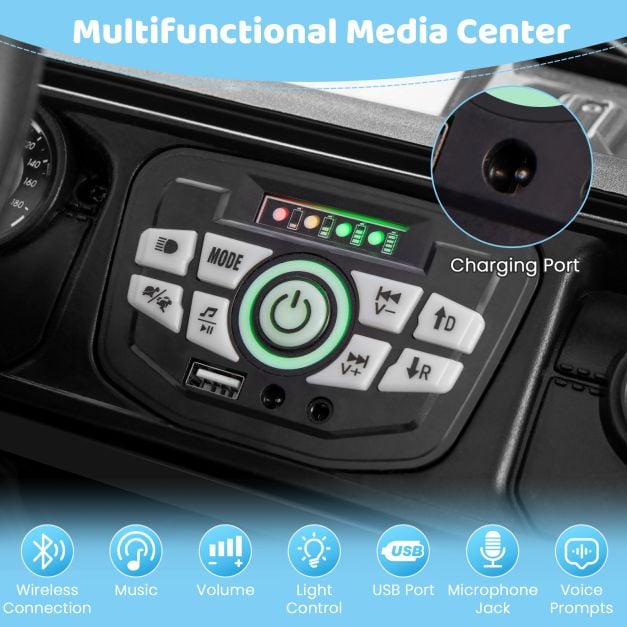 This electric car offers entertainment features like voice prompts, wireless connectivity, volume adjustment, a USB port, microphone input, music, and lighting controls. The ride on car, ASTM compliant and CPSIA certificated, allows for dual controlling ways. It can be steered via a 2.4G parent remote for 3-level speed or with manual modes for 2-level speed. In addition, kids can step on the foot pedal for speed adjustment, together with a button for direction control. Equipped with sturdy spring suspension and rugged tires, it can smoothly traverse any surface. It is adorned with realistic details like LED lights, functional mirrors, locking doors, and a power display. Safe and Easy Driving: Embrace the excitement of the 12V kids' ride-on truck with a stable 2WD driving design. The one-button start ignites the adventure instantly, while the soft start and slow stop feature ensure a smooth and safe ride every time. Multimedia Functionality: The electric car boasts voice prompts and a smart wireless connection, complete with volume control and a USB port for personal playlists. Add to that a microphone jack for budding performers and light control for dynamic rides. Remote or Manual Control: The ride-on car features a 2.4G parent remote control to ensure full direction control, 3 speeds of 1-5 KPH, and an emergency brake. With a mode switch key, it also supports manual driving for 2 speeds of 2-5 KPH. Ideal Spring Suspension: Ready for any terrain, such as brick, asphalt, and grass, the 12V kids toy car comes with strong treaded wheels for reliable traction. In addition, the inclusion of a spring suspension system delivers a bump-free ride. For Realistic Adventure: The ride-on car, EN71 certificated, features more premium details, including LED lights, rotating rearview mirrors, and lockable double doors. Besides, it includes a battery display for monitoring playtime.
