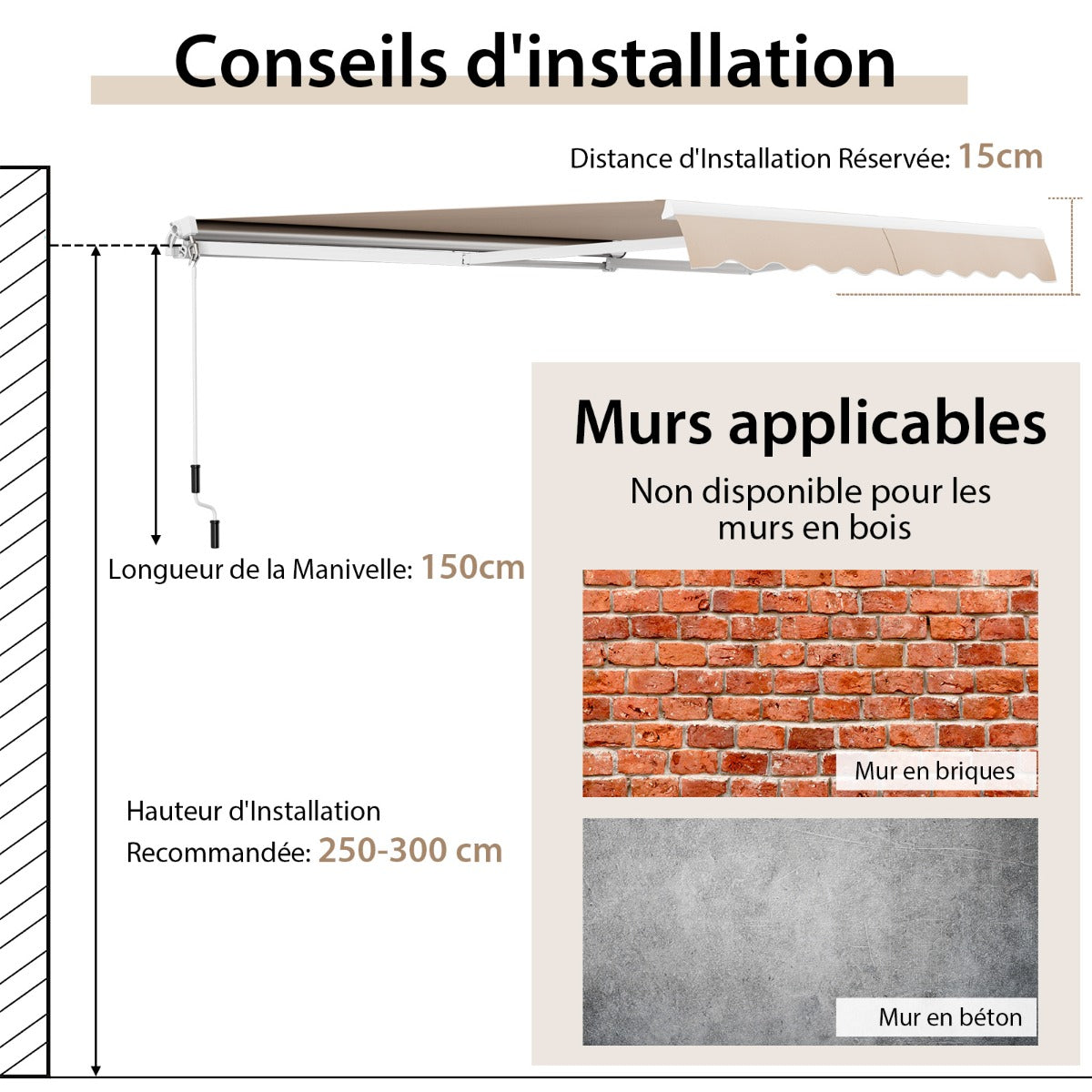 -Thickened cloth with PA coating for sun protection-Longhand crank to help you open and close the awning easily-The angle of the shed can be adjusted from 5 to 35 degrees-Premium aluminum alloy and cloth make the awning durable-Concise style to coordinate other decorations very well-Installation is easy with detailed installation instructions-Suitable for most the porches, terraces, and windows-Can be installed on cement walls, wooden walls or brickwork