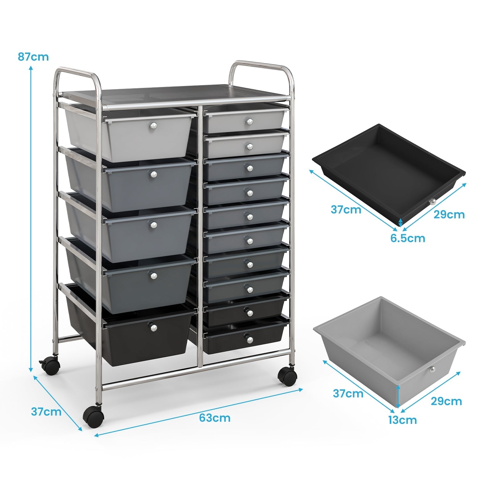 Colour: Black/ Clear/ Multicolour/ Rainbow/ Yellow Material: Iron + PP Overall size: 63 cm x 37 cm x 87 cm (L x W x H) Inner Size of big drawer: 37 cm x 29 cm x 13 cm (L x W x D) Inner Size of small drawer: 37 cm x 29 cm x 6 cm (L x W x D) Total weight capacity: 20 kg Diameter of wheel: 4 cm Box Qty:1(May vary by batch)Package include: 1 x 15-drawer mobile storage trolley 1 x instruction manual