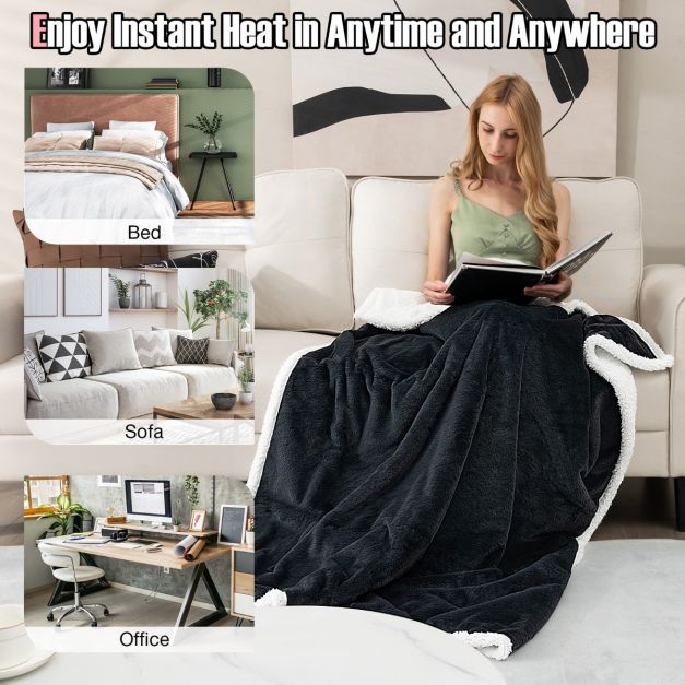 Enjoy incredible warm and cosy winter with the electric heated blanket throw! The electric heating blanket has a smart controller with LED screen, you can easily adjust the temperature of 10 levels and the timing of 9 levels to meet the needs of different people and save power. Adopting faux rabbit velvet and sherpa fleece, the soft touch of the heated blanket will ensure a very comfortable experience in various scenarios, such as bed, couch, or sofa. Therefore, it will be the perfect choice to accompany you through the cold winter! In addition, the heating blanket has both overheating and overcurrent protection, so you can use it with complete confidence. Moreover, this heating blanket can be washed by machine and hand for long service life. Please read the instructions carefully before cleaning. If you are looking for such a heated blanket, don't hesitate to place an order! Temperature andTimer Adjustment: Equipped with an intelligent controller, thereversible heated blanket throw can adjust the temperature at 10 levels to meet the needs of different people. In addition, the 9 hours auto-shut-off function enables you to pre-set the shutoff time for a sound sleep. Safe Overheat Protection andPowerful Heating: With advanced PTC heater, the electric over blanket can be heated quickly and distribute heat evenly. And the heated throw blanket has to overheat and overcurrent protection to avoid burning you. Double-Sided Reversible Soft Fabric: Composed of durable and premium faux rabbit velvet and sherpa fleece, both sides of the heated blanket throw are warm, smooth and skin-friendly. No matter which side you use, this large heated blanket is dedicated to bringing you the ultimate luxury and comfort. Multiple Use Occasions: The 154cm power cord allows the double-sided heating blanket to warm you in bed, on the sofa or in the office, and improve your efficiency during reading, working and napping. Therefore, the reversible electric throw blanket would be a thoughtful gift for the elderly, girls, women or those with cold hands and feet. Hand and Machine Washable for Easy Care: This fleece electric blanket is not only hand washable, but also machine washable to free your hands on cold winter days and last longer softness. Note: Do not dry clean, bleach or iron and please make sure the coupler and power supply have been removed before cleaning.