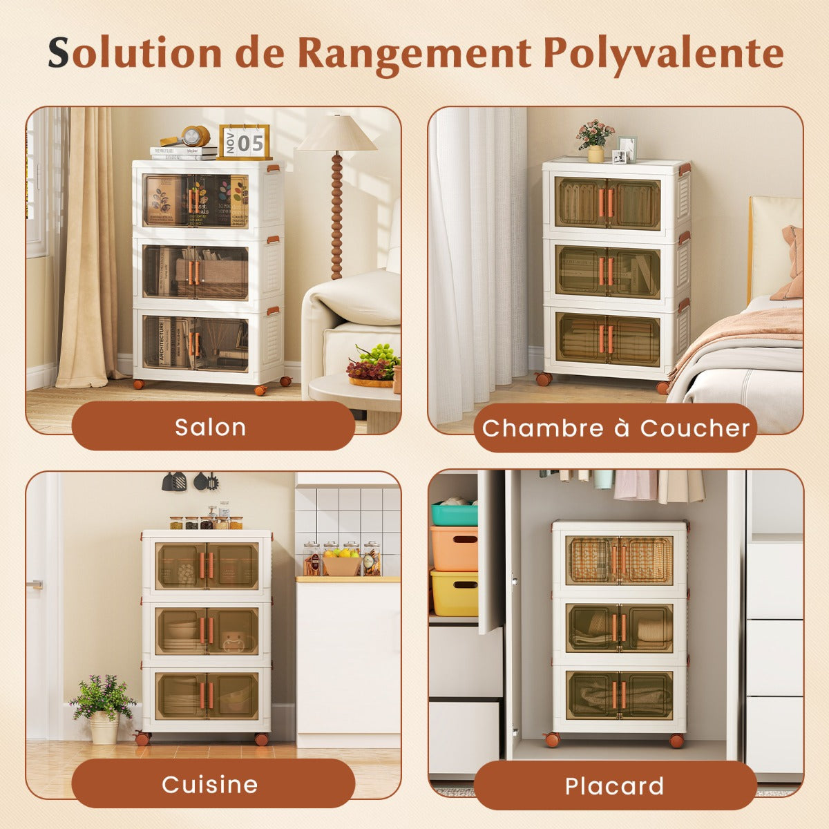 156L Collapsible Storage Bins with Lids Set of 3 Stackable Plastic Storage Boxes with Wheels White Storage Containers