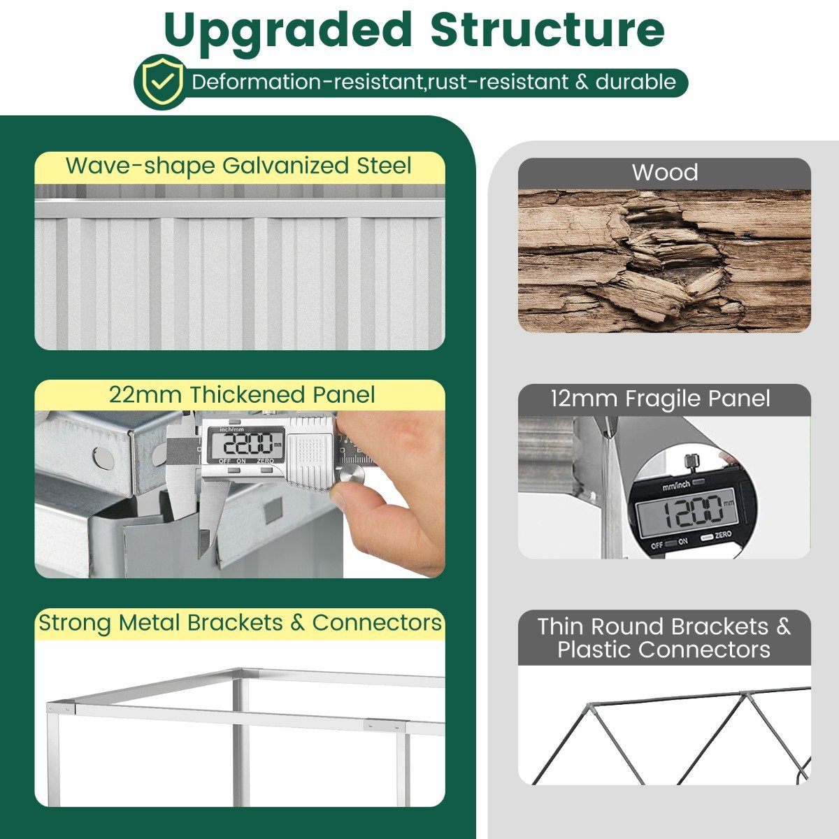 This raised planter box with greenhouse cover not only creates more space to nourish various plants to grow, but also allows them to thrive! This large rectangular garden bed provides plenty of growing space to raise vegetables, herbs, flowers and plants. The greenhouse cover made of premium PE provides maximum protection for plants even in harsh weather. Meanwhile, it will block out unexpected animals. And you can easily roll up the zipper window for easy planting and watering. Made from galvanized steel, our raised planter box achieves good corrosion resistance and provides sturdy construction. Furthermore, the open-ended base of the garden box will facilitate the drainage of excess water. Whether planting in the yard, garden, lawn, or vegetable field, this metal raised garden bed will be a great choice! If you are looking for a garden bed like this, do not hesitate to place an order! Large Planter Box for Various Plants: This raised garden box with a depth of 30cm holds volume of 0.5 m3 of soil. This rectangular garden bed provides spacious growth space for deep-rooted plants like potatoes, tomatoes, broccoli, etc. And it is tall enough to keep pets away from the garden planter! Durable PE Cover and Extra Gift: This mini greenhouse has a durable PE grid cover, which not only ensures frost-protection, sun-protection, and rain-resistance, but can keep interior moist, creating an ideal environment for growing plants. Besides, we provide you with a pair of gloves to facilitate gardening work, and T-shaped tags for you to record the growth process of your plants. Strong Galvanized Steel Structure: Made from galvanized steel panels and raised metal frame, our outdoor raised garden bed is rust-resistant, durable and non-deformable for long-lasting use. It has a solid and stable construction and will not crack. What’s more, the strong connections enhance overall stability. Easy Watering and Drainage: The large roll-up zippered window can promote ventilation and is convenient for watering. The smooth zippers provide easy access to your plants as long as you roll up the window and secure it with strong straps. More importantly, the open-ended base provides good drainage and promotes rod growing, idea for various kinds of plant cultivation. Easy Assembly and Removable Cover: Our garden planter features 2 parts(raised garden bed and greenhouse). Detailed instructions ensure easy assembly, just connect the plates together, install the supporting poles, and install the cover. This mini greenhouse with planter box can block out small animals. Or, you can remove the cover to let your plants get more sunshine.