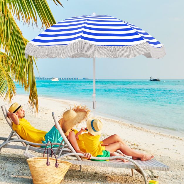 This patio fringe umbrella measures 180 x 180 x 210 cm (L x W x H), offering a cool and comfy shade area for enjoying outdoor leisure time with your family or friends. It adopts a UPF50+ sun-protective polyester canopy with silver coating, which could block up to 98% of the sun's harmful sunlight, ensuring your skin stays safe from sun damage. And the tilting angle can be adjusted in both directions, ensuring you can enjoy comprehensive sunshade coverage throughout the day. Other than that, the umbrella features compact carrying bag, make storage and transportation a breeze. With the combination of elegant tassels and delicate patterns on the canopy, this outdoor umbrella could adds a Bohemian flair to your outdoor space! UPF50+ Sun Protection: The 180 cm outdoor patio umbrella canopy is crafted of premium polyester fabric with silver coating, ensuring UPF50+ sun protection and effectively shielding you from over 98% of harmful sunlight. Additionally, it is also drizzle-resistant and wear-resistant for added durability.Push Button Tilt: The sunshade umbrella canopy can easily tilt 30 degrees to the left or right, which could block the sun from different directions, providing a cool shade area all the time. It is easy to adjust by pushing the aluminum alloy joint.Sturdy and Stable Structure: The fringe umbrella is equipped with a 20 cm extended spiral sand anchor, making it easy to set up and secure in the sand. And it is easy to operate by rotating the handrail. Besides, the umbrella is supported by a rustproof powder-coated metal pole, ensuring good sturdiness.Portable Design and Easy Setup: The umbrella can be easily detached and stored in a portable and lightweight carrying bag, which only weighs 2.5 kg, making transportation a breeze. Also, the 2-section umbrella is also easy to open by connecting 2 sections, pushing the button, and then inserting the latch for fixation.Elegant Fringe Design: This unique fringe patio umbrella is adorned with elegant tassels, decorative finial, and exquisite flower patterns/vibrant striped patterns/elegant cream-white appearance, which adds a fun and playful touch, creating a delightful vacation atmosphere. It is suitable for various occasions, such as gardens, poolsides, yards, commercial areas, etc.