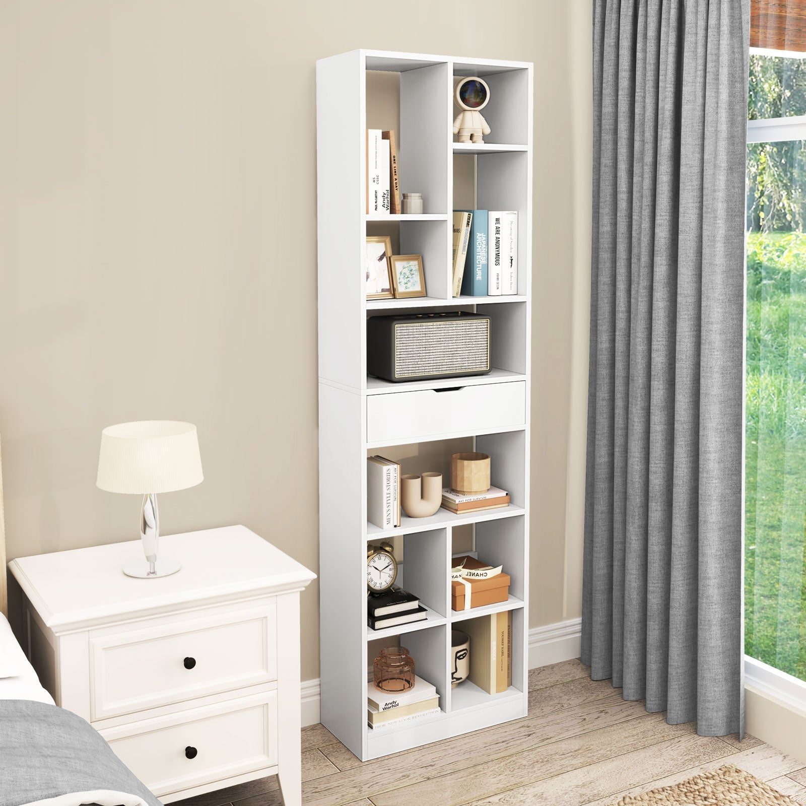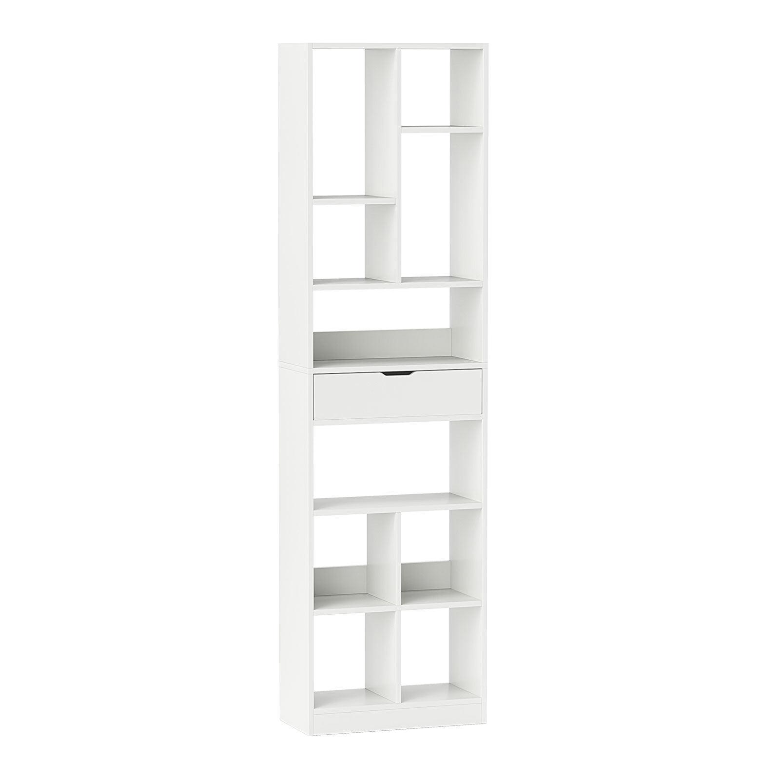 Not just a delight to look at but built to last, this freestanding marvel is perfect for displaying books, cherished plants, and artful handcrafts. Its enduring construction, complete with a storage drawer for personal items, ensures everything stays secure and clutter-free. Thanks to thoughtful safety features like anti-tip kits and 2 anti-fall back panels, it’s a worry-free addition to spaces with kids and pets. Want a touch of luxury? The easy-to-clean surface and smooth, effortless drawer slides add that graceful functionality every home needs. Step up your interior game; make this stylish storage centerpiece yours today! If you are looking for such a product, do not hesitate to buy it! Spacious Storage Solution: This modern bookcase provides 10 open cubes with ample storage space for books, plants, and other decorative items. Additionally, it includes a spacious drawer that offers a private and secure area for personal items. Enduring Construction: Expertly crafted from thick boards, this 10-cube bookcase is designed for longevity with a sturdy construction that can support up to 185 kg. The sleek surface simplifies maintenance with just a quick wipe of a dry cloth. Enhanced Safety & Stability: Standing tall at 180 cm, this wooden bookcase is equipped with 2 anti-tipping kits, which are essential for added stability. This feature significantly reduces the risk of accidents, especially in homes with children or pets. Practical & Stylish Design: The open bookshelf has 2 anti-falling back panels that prevent items from falling off. The sleek cut-out handle offers a modern touch, while the smooth metal slides make opening the drawers effortless. And non-slip foot pads ensures the bookcase remains in place and operates smoothly. Versatile Aesthetic Appeal: With classic white finish and minimalist design, this freestanding bookcase is also a decorative piece that can seamlessly integrate into various room decorations. It is the perfect storage solution for living rooms, bedrooms, and offices.