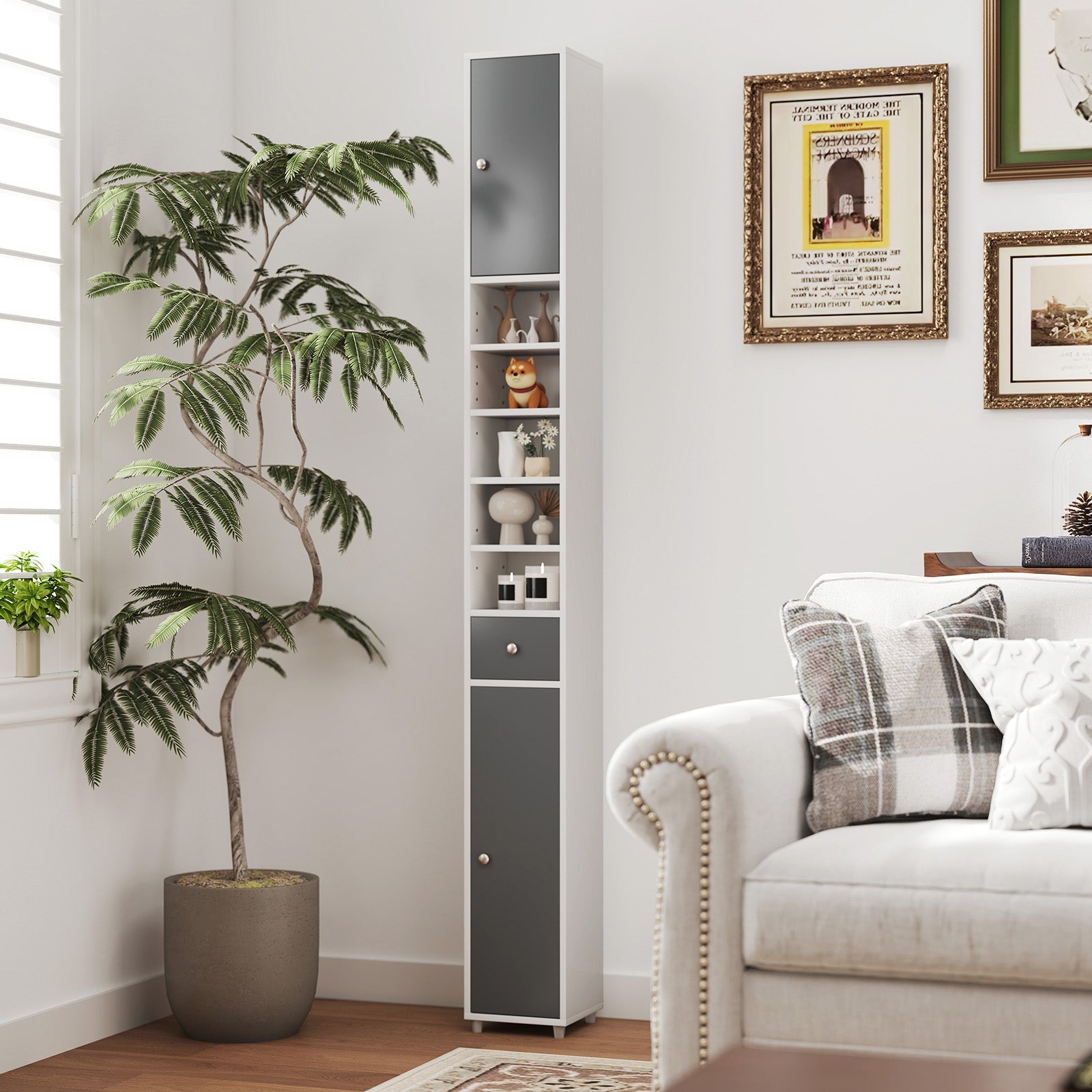 180CM Tall Freestanding Bathroom Cabinet with 2 Doors and 1 Drawer-Gray & White