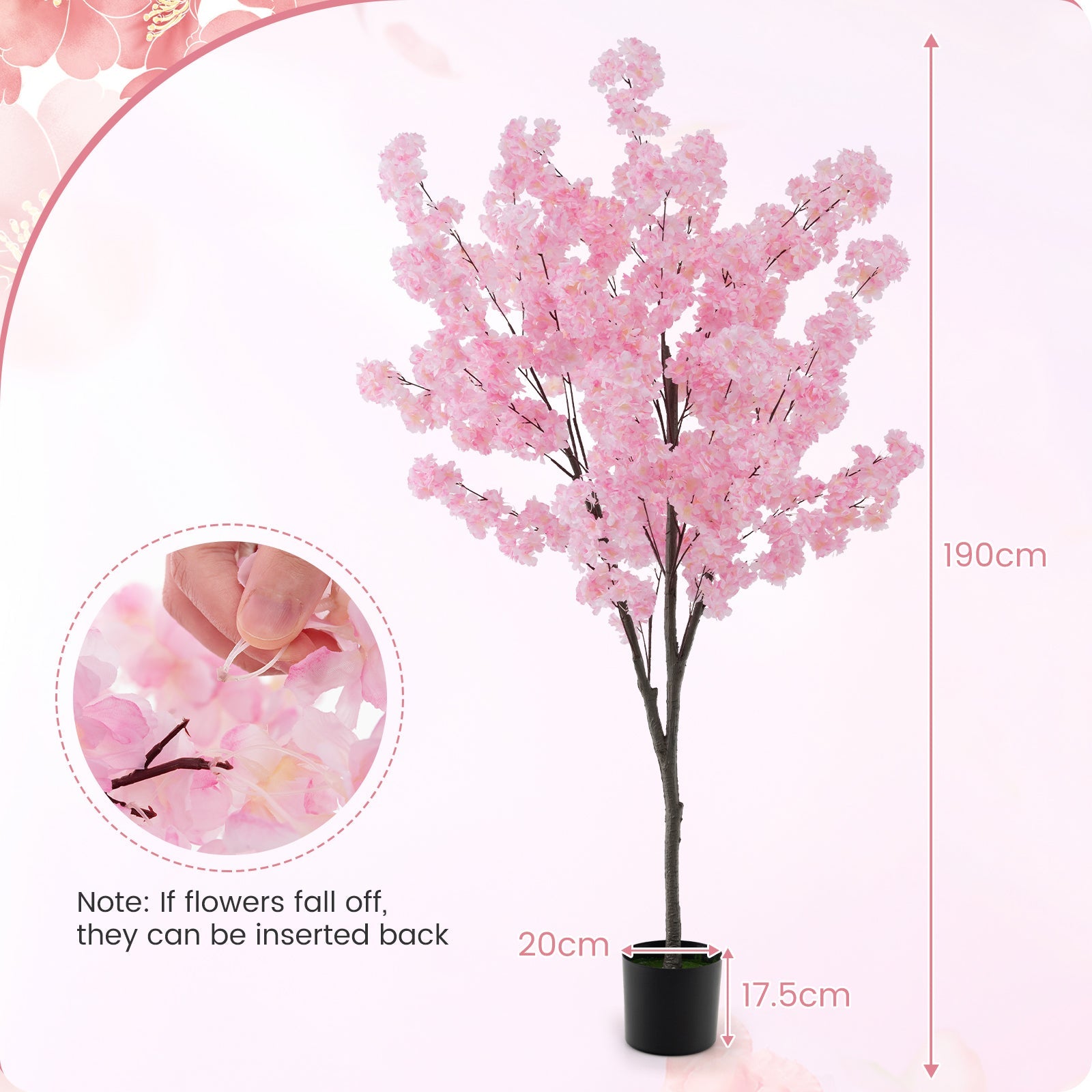 Colour: Pink Material: Polyester Fabric, PE, PP, Cement Height: 190 cm Pot Size: 20 x 17.5 cm (Dia. x H) Net Weight: 5 kg Box Qty:1(May vary by batch)Package Includes: 1 x Artificial Cherry Blossom Tree