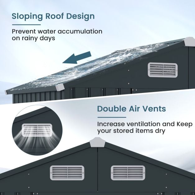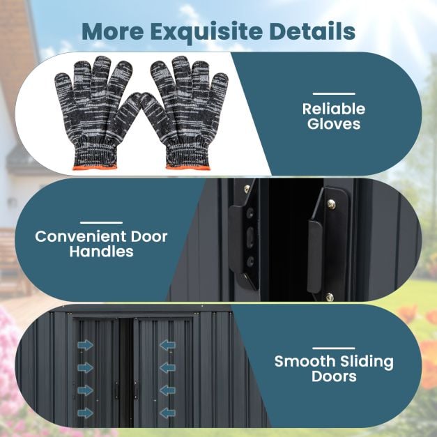 This versatile shed is designed to serve as a storage room for tools, bikes and lawnmowers, meeting your different needs. With its sloping roof and double vents, preventing water accumulation and maintaining optimal ventilation, your stored items will be well protected. With a stable and sturdy frame constructed from rust-proof galvanized metal, reinforced with sturdy roof beams, anti-collision coating and reinforced triangular anchors, your belongings are secure. Smooth sliding doors and innovative grooves ensure easy access. Features : Multi-purpose shed for tools, utilities, trash cans or pet shelter The sloping roof and air vents prevent water accumulation and improve ventilation Stable galvanized metal frame with sturdy beams and reinforced anchors Smooth sliding doors and convenient handles for easy access Rust-proof construction ensures durability and safety Large capacity of 3.25 m3 for ample storage space Includes a pair of gloves for easy assembly Reinforced triangular corners and sturdy crossbar ensure a solid structure