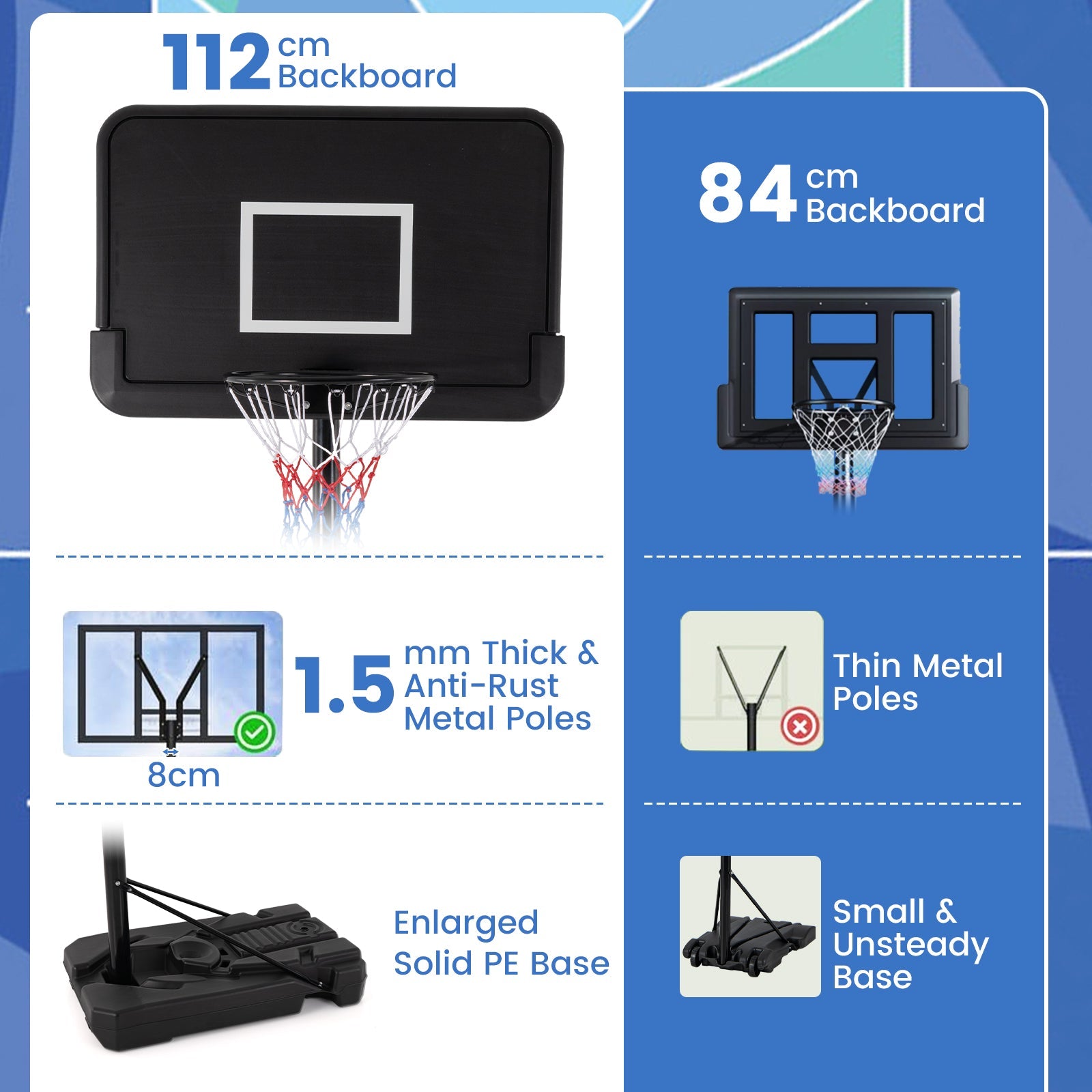 Enjoy endless basketball fun with this portable basketball hoop featuring adjustable heights ranging from 2.6 to 3.65 m, catering to players of all ages and skill levels for a personalized playing experience. Constructed to professional standards, this outdoor basketball goal system boasts a 111 cm shatterproof and impact-resistant backboard paired with a heavy-duty 45 cm standard rim. The large base can be filled with sand or water to enhance stability. With a portable design, users will experience the flexibility of relocating the basketball hoop effortlessly with the wheeled base, making it suitable for various indoor and outdoor settings like playgrounds, gyms, backyards, and driveways. Play basketball anywhere and elevate your game to new heights. Bullet Point: 2.6-3.65 m Adjustable Height: This portable basketball hoop features 8 adjustable heights (304 cm/290 cm/ 274 cm/259 cm/243 cm/228 cm/213 cm/198 xm), accommodating players of all ages and skill levels for a customizable playing experience. Note: heights are measured from floor to rim. Built with Professional Standard: Featuring a 111 cm shatterproof and impact-resistant backboard with a heavy-duty 45 cm standard rim, this outdoor basketball goal system meets an NBA standard, offering professional-level playing experience. Large and Stable Base: The 109 cm x 71 cm enlarged base can be filled with 109 kg of sand or 95 kg of water to increase stability. With a triangular structure, the base provides strong support to the main pole, avoiding tip-over accidents. Robust Construction: This basketball goal is built with 1.5 mm thick and anti-rust metal poles and an enlarged solid PE base for long-lasting service. The Y-shaped backboard bracket, reinforced corners and shock-absorption springs are built to withstand intense games. Have Basketball Fun Anywhere: The base with wheels allows for easy relocation of the basketball hoop, whether you're setting up for a game or moving it for storage. This basketball hoop is suitable for various indoor and outdoor places, such as playgrounds, gym, backyards and driveways.