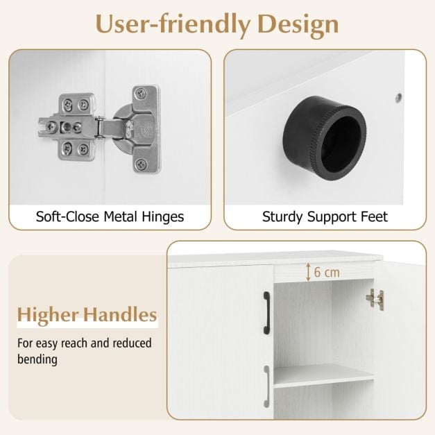 Tight spots in your home? No problem! This all-in-one chic storage cabinet, stylish enough to double as a shoe rack or an elegant buffet sideboard, is your perfect space-saving solution! With dimensions crafted perfectly for small spaces, it not only fits like a dream but supports up to 80 kg of your favorite items. Customize your storage with its adjustable shelf - tailor it just the way you like! Built to last, crafted with care, and designed for stability, this piece comes with anti-tip features and sturdy support feet. Bonus: it’s super easy to use, with high handles and quiet, soft-close doors. Say goodbye to clutter and hello to style! Elevate your space now! Bullet Point: Squeeze More into Less Space: With its compact dimensions of 80 x 32 x 82cm (L x W x H), this storage cabinet is idealfor small spaces. Whether you need a sleek shoe cabinetora stylish buffet sideboard, this versatile piece fits seamlessly into any tight spot. Tailor Your Storage to Perfection: The 2-door cabinet features a5-position adjustable shelffor customized storage space. Easily adjustthe shelf height or removeit altogether, creating the perfect storage solution for items of all shapes and sizes. Rock-solid Construction: Built with thick, robust boards, thisconsolecabinet boasts a strong and enduring construction that can handle up to 80 kg of weight with ease. Plus, its sleek finish not only looks great but also makes maintenance a breeze. Added Stability: No wobbling or tipping here! The accent cabinet comes equipped with 4 sturdy support feetand 2 anti-tipping kits, ensuring excellentstabilityto protect your belongings and family members. Ease of Use at Your Fingertips: Designed with your comfort in mind, the higher handle position allows for easyreach andreducedbending. And with soft-close metal hinges, the shoe cabinet doors close quietly and smoothly.