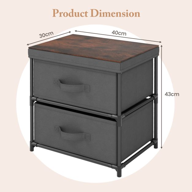 Color: Black + Rustic Brown Material: Non-woven Fabric, Metal, MDF, PP Overall Dimension: 16" x 12" x 17" (L x W x H) Internal Dimension of Drawer: 14" x 11.5" x 6" (L x W x H) Net Weight: 3.5 lbs Package includes: 1 x Storage Dresser 1 x Instruction