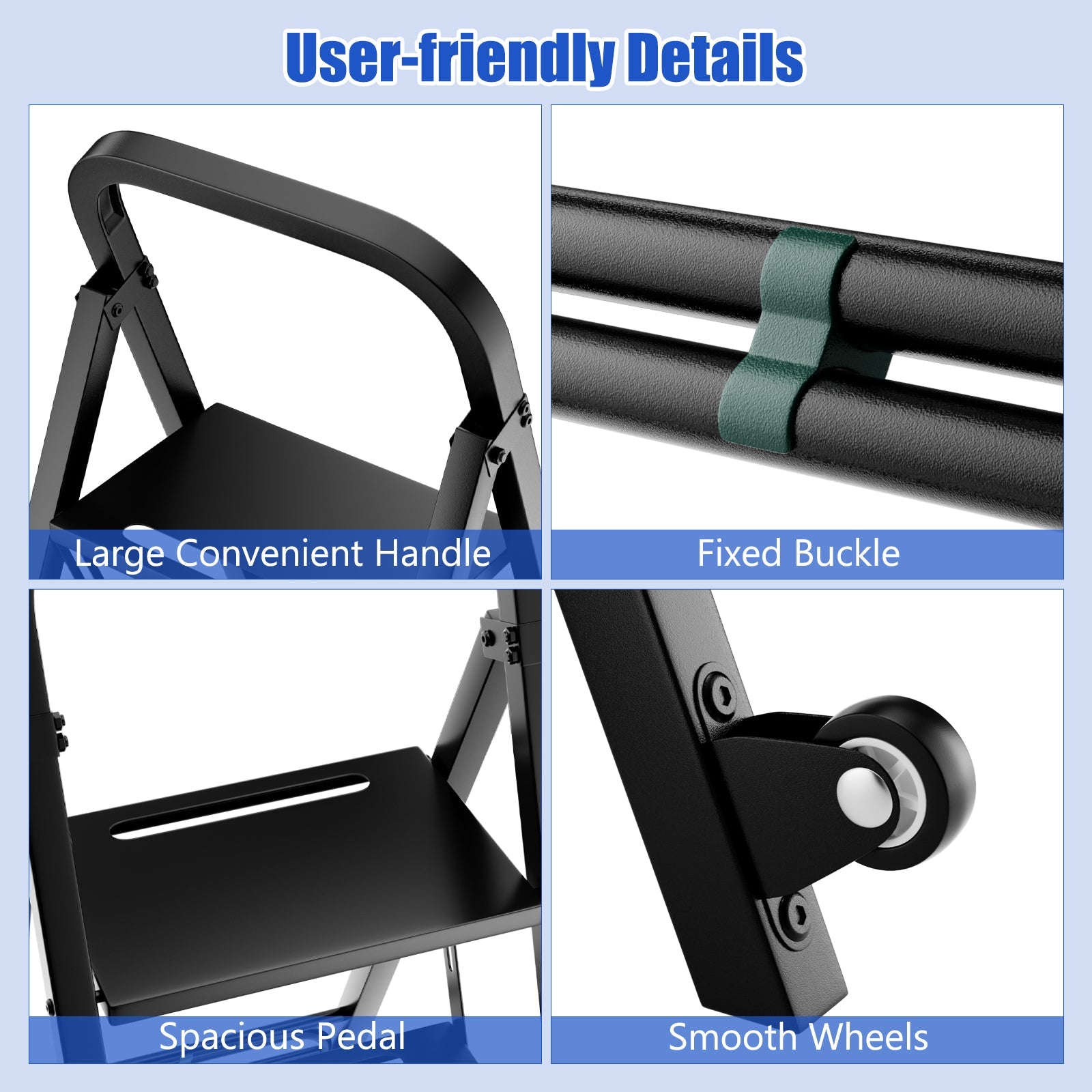 This 2-in-1 hand truck and ladder must be a great helper for your garage and home! This innovative 3-step ladder is designed for your safety with 3 non-slip spacious pedals and a stable triangular structure, which doubles as a household dolly cart with 2 directional wheels for easy movement. Featuring a wide handle for grasping, this versatile utility cart and ladder also includes a foldable storage shelf for added convenience. Besides, made of heavy-duty metal, the ladder dolly cart has an excellent load-bearing capacity, adequate for daily use. Most notably, the folding design of the mobile handcart with ladder does not take up too much living space when not in use. 2-in-1 Versatile Design: This 2-in-1 hand truck and ladder is definitely a great and innovative creation that will make your life easier! As a portable hand cart, it can ease the burden of heavy lifting, while as a 3-step ladder, it can solve the problem of not being able to reach high places. Easy to Fold and Move: The utility cart with ladder can be folded for easy storage, and the bottom storage shelf can also be folded up when not in use, ideal for limited space. In addition, the handcart can be moved easily, because it has 2 smooth directional wheels, which saves your energy. Super Load-bearing Capacity: The hand truck is made of heavy-duty metal with a maximum weight limit of 250 kg, while the ladder can carry things up to 200 kg. Thanks to the ladder's sturdy triangular structure and wide pedals, you can stand firmly on the pedals and remain stable. Many User-friendly Details: There are lots of well-made and considerate details, such as a fixed buckle to prevent the storage shelf from unfolding as well as an extended handle that is for you to grab. Moreover, the non-slip textures on the pedals ensure your safety without slipping and falling down. Multi-purpose Use: This household hand truck ladder can take care of all the hassles of carrying and accessing high places, suitable for living rooms, bedrooms, garages, etc. Thus, you can effortlessly carry goods, pick up high objects, hang decorative pictures, whitewash walls and decorate Christmas trees.
