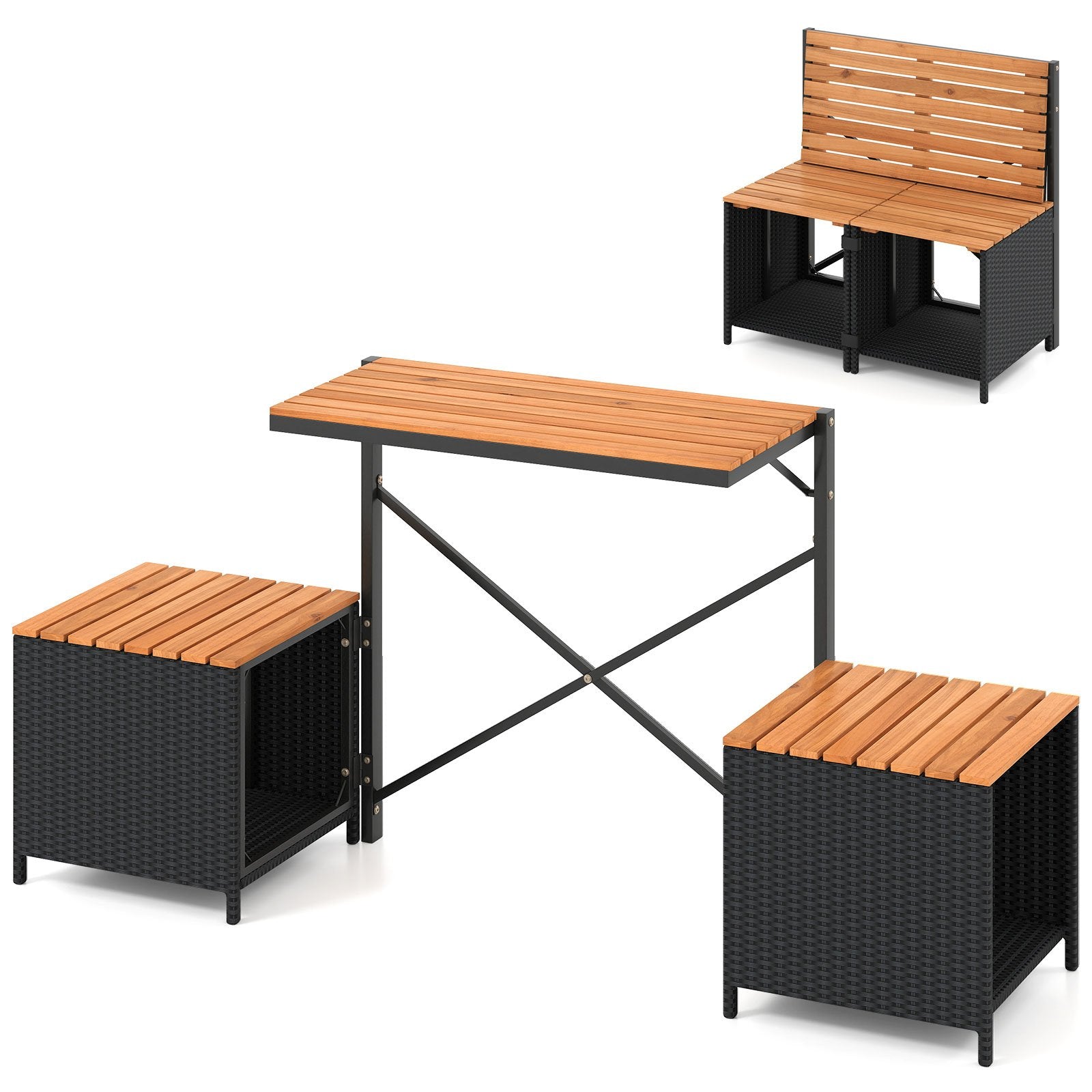 Colour of Rattan: Black Colour of Wood: Natural Materials: Acacia Wood, PE Rattan, Metal Dimensions of Table and Chairs Set: 168 √ó 46 √ó 81 cm (L √ó W √ó H) Dimensions of Loveseat: 84 √ó 46 √ó 81 cm (L √ó W √ó H) Size of Each Chair: 42 √ó 42 √ó 42 cm (L √ó W √ó H) Size of Tabletop: 79 √ó 38.5 cm (L √ó W) Seat Size of Loveseat: 84 √ó 33.5 cm (L √ó W) Backrest Height: 40 cm Total Net Weight: 12.5 kg Weight Capacity of Table: 45 kg Weight Capacity of Each Chair: 180 kg Weight Capacity of Loveseat: 360 kg Box QTY: 1 (May vary by batch) Package Includes: 1 √ó Outdoor Convertible Bench 1 √ó Instruction Manual