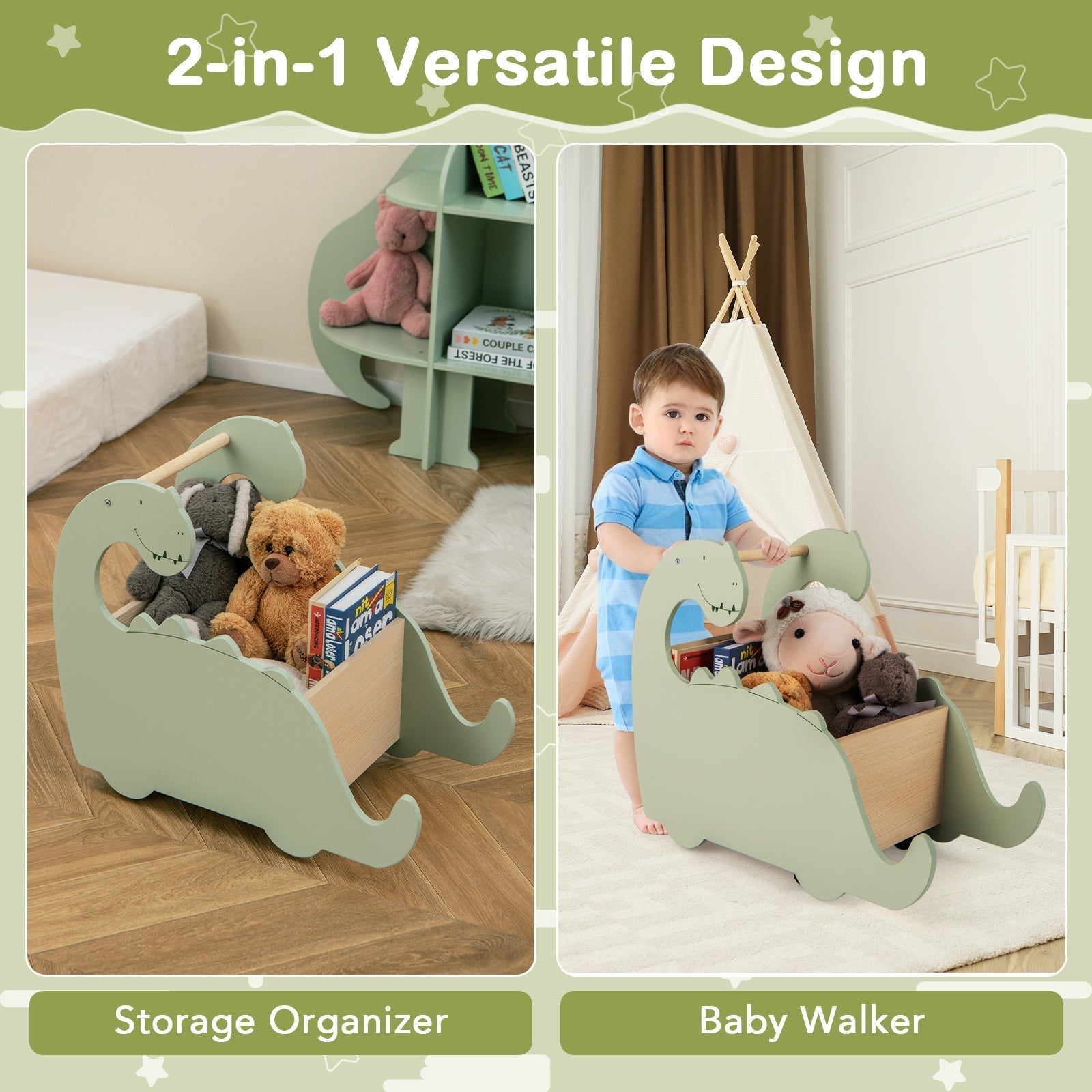 -4 universal wheels make it easy to move the baby push walker-Ergonomic design helps your child develop proper walking posture-2-in-1 versatile design as a storage organizer or baby walker-Easy for kids to grip thanks to the pine wood handle-Splinter-free surface prevents babies from accidental injuries-Attractive to little ones with a cute dinosaur shape-Perfect gift for toddlers aged 18+ months old-Develop coordination, motor skills, independence, and muscle strength-ASTM and CPSIA compliant for enhanced reliability