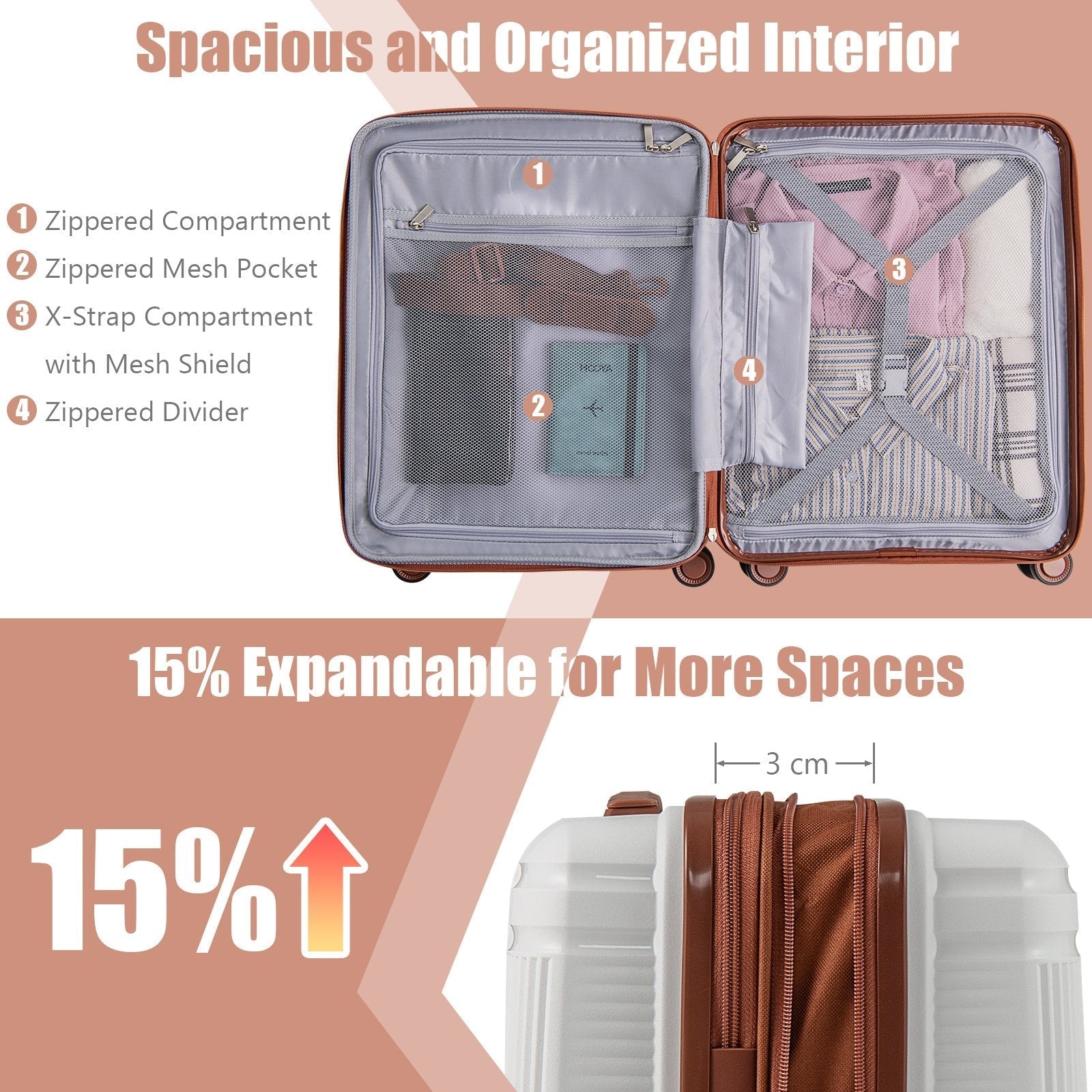 Embark Your Adventures with Ease and Style! Our 2-piece luggage set includes a 14” hardshell cosmetic case and a 20”carry-on suitcase, which meet all international airline regulations for carry-on size, ensuring a hassle-free travel experience. And the suitcase offers 15% expandable capacity for packing more luggage on the trip. The cosmetic case can be carried by hand, hung over the shoulder, or secured on the suitcase pole. Besides, the suitcase boasts an innovative interior layout while the cosmetic case provides several compartments inside, providing ample storage space for easy organization and wet/dry separation. Enhancing convenience and security, the suitcase features a built-in USB port for on-the-go charging and a 3-digit TSA lock that is different to be damaged. More than that, it is equipped with smooth spinner wheels and a 4-level telescoping handle, allowing for smooth maneuverability and effortless navigation through airports and crowded spaces. 2-Piece Luggage Set: This travel set includes a 14”/35 cm cosmetic case with an 11 L capacity and a 20”/50 cm carry-on suitcase with a 35 L capacity, designed to comply with international carry-on standards. Additionally, the suitcase is 15% expandable for more space, while the cosmetic case comes with a convenient handle, an adjustable shoulder strap for easy carrying, and an elastic band to attach securely to your rolling luggage. Sufficient and Classified Storage Space: The interior of the suitcase features zippered compartments on both sides for secure packing and cleverly designed internal dividers for organized storage. Moreover, the cosmetic case includes multiple compartments for toiletries, makeup tools, nail art supplies, and skin care products. USB Charging and TSA Lock: The carry-on luggage is equipped with a built-in USB port on the side for charging your devices on the go, complete with a nifty internal pouch to store a power bank. Furthermore, it boasts a 3-digit TSA lock, ensuring your belongings are safe and sound. Effortless Maneuverability: The suitcase features an enhanced 8-wheel design that allows for a smooth 360° rotation, ensuring quiet and effortless movement. Additionally, the telescoping aluminum handle can be easily adjusted in 4 heights, which are ergonomically designed of users of different heights. Reliable Material: Constructed from lightweight yet tough PP material, this luggage set is built to withstand the rigors of travel better than traditional ABS. Besides, it adopts a gloss wave surface with frosted textures, offering a modern and sophisticated look to your travel gear.