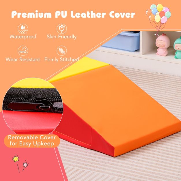 Made with high-density EPE foam filling, this soft play set offers a cushioned and secure surface for play. The step and slide climbers not only promote physical activity but also enhance gross motor skills and sensory development, aiding in balance, coordination, and strength. The PU leather cover is easy to clean and maintain for your child's playtime. The hook and loop fasteners create a strong connection between the foam blocks, allowing for various play configurations such as climbing, sliding, and crawling. Safety First: This 2-piece soft play set provides a secure play environment for infants and toddlers with its high-density EPE foam filling, offering a gentle and cushioned surface for exploration and play. Develop Through Play: The step and slide climbers promote physical activity, gross motor skills, and sensory development as little ones climb or crawl on them, enhancing balance, hand-eye coordination, and strength building. Easy to Clean: The premium PU leather cover is waterproof, skin-friendly, wear resistant and firmly stitched. The removable zippered cover ensures hassle-free maintenance to keep playtime clean for your child. Versatile Play Options: The hook and loop fasteners provide convenient and strong connection between 2 foam blocks. So, the step and slide design offers multiple play configurations, allowing children to climb, slide, crawl, fostering creativity and imagination. Product Specifications: The assembled step and slide measures 100 x 50 x 25 cm (L x W x H). Designed for convenience, this soft foam climber set is lightweight and portable, making it easy to move from room to room for playtime anywhere.
