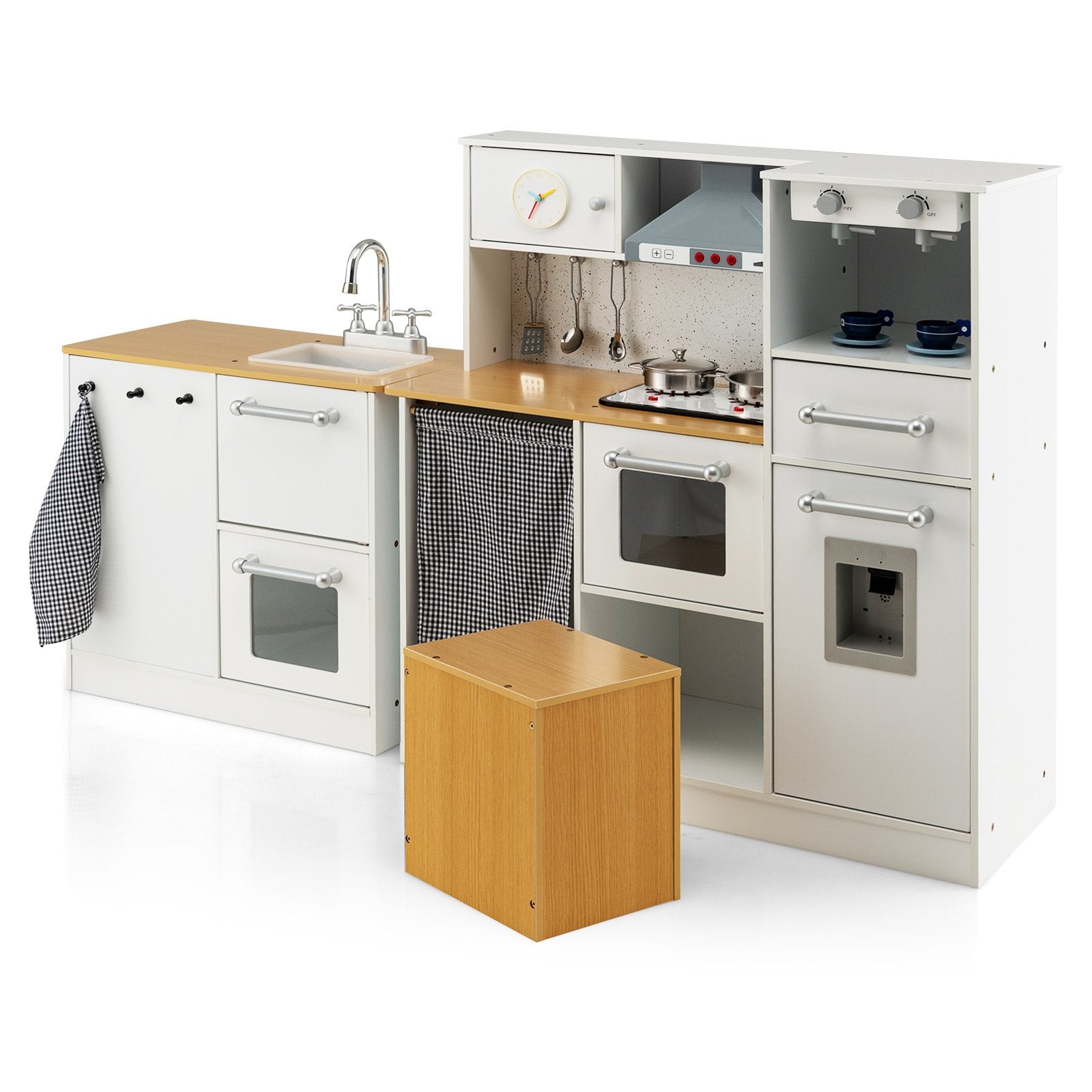 Color: White + Natural Material: MDF Dimension of Kitchen: 79 x 29 x 81 cm (L x W x H) Dimension of Washing Machine: 53 x 29 x 65 cm (L x W x H) Net Weight: 23.5 kg Suitable Age: 3+ Box Qty:1(May vary by batch)Package Includes: 1 x 2-Piece Kids Wooden Kitchen Play Set 1 x Spaghetti Server 1 x Spatula 1 x Soup Spoon 1 x Pot with Lid 1 x Skillet 2 x Coffee Cups 1 x Instruction Manual Installation Video