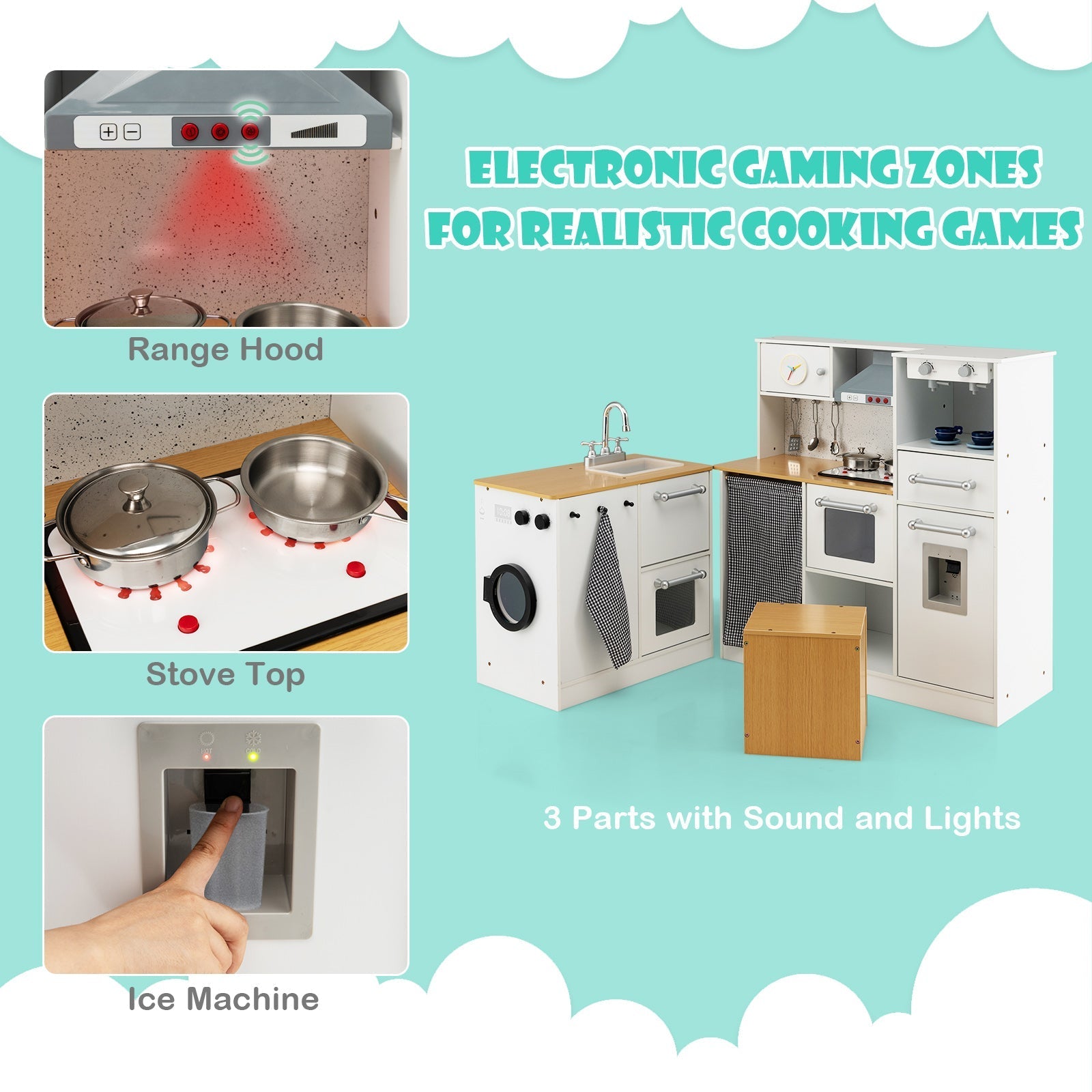 With complete accessories and realistic appearance, the play set can instantly catch your kids’ attention. It’s composed of 2 separate parts and has multiple playing areas so that children can experience different playing fun. The pretend range hood and stove burner can simulate cooking sounds and emit warm lights, letting kids immersed in the role-play game. Besides, there is plenty of storage space to accommodate the accessories. What’s more, kid’s safety is our superiority. This pretend chef toy set is constructed of durable MDF and designed with round corners, ensuring long service life as well as safe use experience. 2-Piece Play Set: Different from ordinary kids play sets in the market, the 2-piece pretend toy set contains 2 parts, kitchen and washing machine, which can be freely arranged according to your room layout and kids’ preference. Meanwhile, the roomy playing area means that your little one can invite more friends to share game fun together. Designed for Stability and Safety: The well-selected and odorless MDF create a stable and durable playing environment for children. And the surface is smoothly polished and rounded for safe play. The great material of kitchen play set ensures high-level of safety. Realistic Cooking Experience: Kids can enjoy hours of play house fun with a variety of lifelike kitchen supplies, authentic coffee maker and water dispenser. And the range hood and stove with vivid sounds and bright light also mimic a real-life experience. Require 6 x AAA batteries (not included). Various Storage Options and Practical Stool: In addition to the interesting kitchen equipment, the play set also features sufficient storage space. After the game, you can store accessories and other toys in the pull-out drawer and cabinets. Better yet, the stool not only provides a comfortable seat for children, but also can be used as a storage box. Perfect Gift for Kids: This 2-piece kitchen play set combines entertaining and educational features in one, providing a dreamy play spot for kids and helping them develop hand-on ability, imagination, social skills and more. Hence, it’s a perfect gift choice for boys and girls on the birthday, Christmas Day and other festivals.
