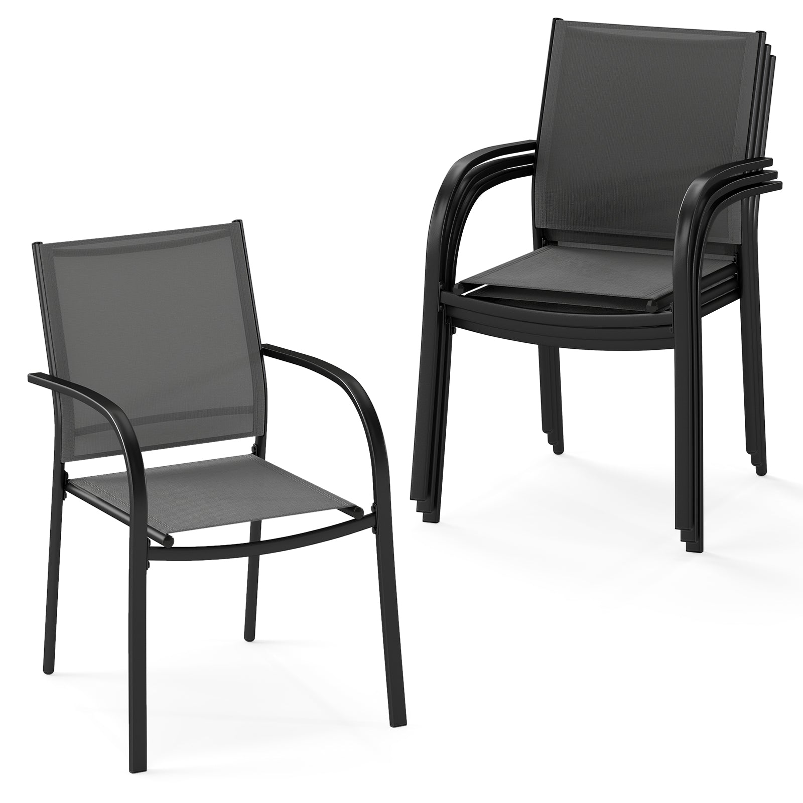 With breathable fabric, curved backrests and ergonomic armrests, these patio bistro chairs are comfortable enough to sit on. And they can be stacked when not using them, greatly saving your space. What's more, the anti-rust steel frame and fast-drying fabric make these patio chairs fit outdoors. So you can place them in different places based on your demands. Stackable Chairs: If it’s getting cold outdoors and you do not need these patio chairs in a short time, you are able to stack them one by one in order to save your home space. In addition, the lightweight design offers great convenience for you to move them effortlessly. Upgraded Comfort: Designed with ergonomic backrests and curved armrests, these outdoor dining chairs fit your body perfectly, bringing comfortable sitting experience. At the same time, the fabric is breathable, which avoids the stuffy feeling caused by sitting for a long time. All-Weather Materials: Constructed of heavy duty steel frame with powder coated, these patio bistro chairs are anti-rust and durable. Coupled with the help of quick-drying fabrics, these garden dining seats are perfect for outdoor use. And the anti-slip foot pads ensure additional stability. Wide Application: Featuring modern appearance and practical design, these stackable patio chairs are easy to blend with your home decoration while making a great addition. Therefore, you can use these bistro chairs in your patio, garden, balcony, deck and backyard, etc. Easy Installation: These patio bistro dining chairs are so easy to assemble that you don't have to worry about it. The instruction describe the installation process in detail and all the necessary accessories for the product are included. Just follow the instruction and you will get 2 pieces outdoor deck chairs without spending much time and effort.