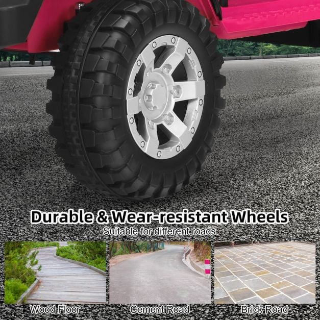 Allow your child to feel the joy of driving with this 12V kids ride on truck! Built with a grid front window, ultra-bright LED lights and 2 doors, this kid's ride-on truck will bring endless fun while the kid is driving. The soft start design avoids the sudden beginning and promotes the driving experience. The kids ride on trucks can move forward or backward. Also, there is a rocking mode for changing fun. For kids who are too small to operate the steering wheel and foot pedal, parents can deal with the kid's 12V ride-on car with a handy remote control. To add to the fun of driving, you can connect to your devices with USB or AUX ports. And then, play your kid's favorite music for him/her. If you are looking for such a product, do not hesitate to take it to your home! A Safe and Smooth Ride: This 12V ride-on truck has front and rear spring suspension, and a slow start function to make sure a safe playtime on almost any terrains. Always buckle your kids on the seat belt when they get in the car and the ample seat makes sure that the ride is comfortable and joyful. Realistic Driving Experience: With openable doors, grid front window, or the steering wheel, all the exquisite details are mimicked from the real truck. The electric car for kids rides forward and backward, and it also has a rocking mode. This car toy roars when kids hit the power, horns can beep, and with the flashing LED lights, your little racer is given a ride as realistic as possible. Two Control Modes: 1. Pedals and steering wheel is one way for kids to drive the car. 2. Using parental remote (1.5V AAA battery not included) is the other way. And the latter overrides the former. Also, there is a handle under the car for easy-moving, in case you forget to put enough charging last night. Music and Audio Options: Featuring music and radio, this ride-on car manages to bring more joy to kids. Equipment integrated control system to increase much more pleasure. MP3, USB outlet, functions mean to plug in other music devices or connect phones for more audio options for your kids preference. A Gift of Perfection: This kids ride-on truck comes with multiple color choices and will be a great encouragement to your kids over 3 years old. Solid PP cover makes the battery powered ride-on car a lasting delight with a maximum weight of 50 kg. Require 8-12h of charging for 1 hour of fun.
