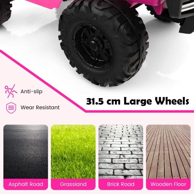 Made of durable and safe PP and metal, the 2-seater ride-on truck will accompany kids for years. Moreover, the wide seat with safety belt holds up to 2 kids at the same time. When they are younger, you can control the electric vehicle by remote control. As they grow older, they are able to manually control the car. The steering wheel and foot pedal enable little ones to have a real driving experience. And the rotatable rearview mirrors as well as the big wheels mimic a real car. With built-in music, radio and USB port, the 24V battery-powered truck entertains kids while driving. Furthermore, the bright LED lights and extra LED light strips bring more fun for playing. If you are looking for a 2-seater ride-on truck like this, do not hesitate to place an order! Excellent Performance: This ride-on car features a 24V battery and motor for powerful running. After charging, the 24V battery-powered electric vehicle allows kids to play up to 2 hours continuously. Besides, with a low speed of 2.6-3 km/h and high speed of 5.5-6 km/h, children can go forward or backward at desired speed. 2 Available Driving Modes:For younger kids, parents can control the ride-on car through the remote control for safer use. For older ones, they can drive by themselves for a more immersive driving experience. Moreover, the functional steering wheel makes the horn and engine sounds for more fun. Safe andSteady Construction: Made of high-quality PP and heavy-duty metal, the toddler ride-on truck is built to last. And the wide seat with a safety belt holds 2 people securely. More importantly, the 4 large wheels are anti-slip and wear-resistant, which can work well on varying types of road. Multifunctional Control Panel: The one-button start function makes this kids electric vehicle easy to use. Kids can enjoy the integrated music or radio while driving. Also, you can connect to electronic devices by the USB port to play their favorite songs. What’s more, there are bright LED lights and strips to add fun. Perfect Holiday Gift for Kids: With kid-friendly design, the 24V electric car is a great gift for toddlers aged 3-8 years old, accompanying them to grow up. Children can enjoy the fun of driving with their partner. Likewise, you are able to enhance parent-child interaction for family time.