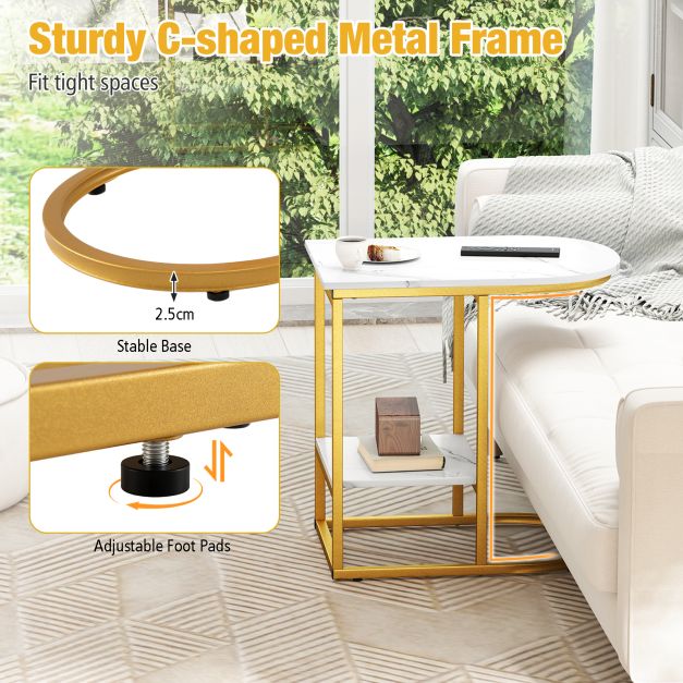 2-Tier C-shaped End Table Modern Sofa Side Table with Metal Frame-White