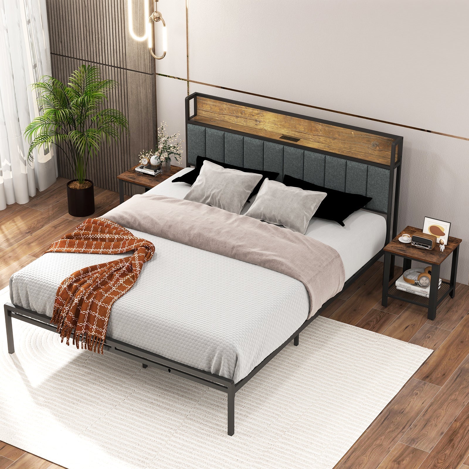 2-Tier End Table Square Sofa Side Table with Mesh Shelf-Rustic Brown