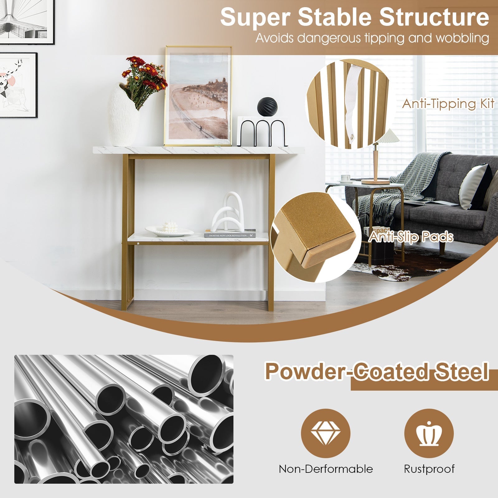 This 2-tier console table can well suit your storage needs and will be a perfect piece in your home! It combines storage, decoration and display all into one. Wide tabletop and bottom shelf provide you with multiple storage options for assorting wide arrange of daily items. Thanks to the durable MDF and powder-coated steel frame, this entryway table is stable and strong enough for long-term use. More, the anti-toppling device also make an upgraded in stability. Our stylish faux marble console table is compatible with different home styles and interior decoration, which works great as an entryway table, foyer table, or buffet table, etc. Impressive Faux Marble Appearance: The console table is designed in faux marble, combining aesthetic beauty with great practicality, delivering perfect visual effect and adding charm to your home. Plus, the gold steel frame creates a deluxe look to your living surroundings, whether in the living room, bedroom and hallway, etc. 2-tier Shelf for Easy Storage: The tabletop measures 120cm in length which is spacious enough to hold vase, collections, plants and other decorative items. Meanwhile, the bottom shelf allows you to access items without restriction and leaves you no worry about the lack of place to store and display a variety of daily supplies. Sturdy Structure Built to Last: Thick MDF is crafted with sturdiness and durability in mind. Additionally, heavy-duty steel slats ensure strong load-bearing capacity and make the table sturdy enough for long-time use. The anti-toppling device attaches the sofa table to the wall to prevent wobbling. Versatile Compact Console Table: Due to its compact size and slim body, the couch table is an ideal choice for small space and works equally well behind the sofa and lean against the wall. In addition to being used as a sofa table, it can be served as an entryway table, foyer table, or buffet table, etc. Worry-free Assembly and Clean-up: All necessary accessories and detailed instruction are tightly wrapped. You can put all parts together without effort. In addition, the smooth surface will not take you much time and effort in daily maintenance.