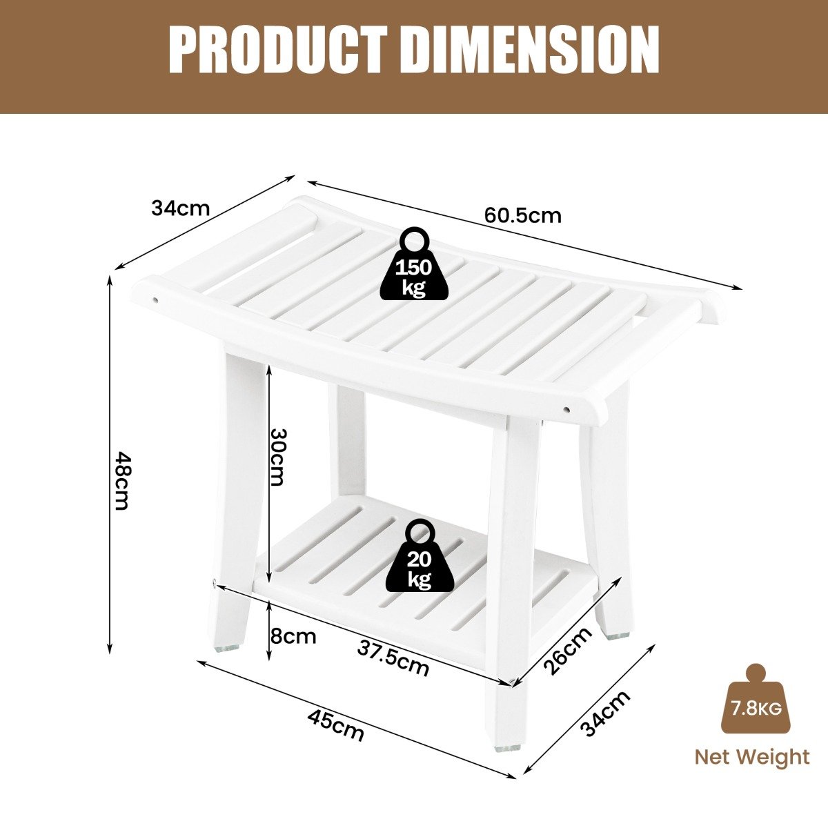Box Qty:1(May vary by batch) Color: White/brownMaterial: HDPEOverall dimension: 60.5cm x 34cm x 48cm(L x W x H) Net weight: 8 kgWeight capacity of top: 150 kgWeight capacity of bottom shelf: 20 kg Package includes:1 x Shower bench1 x Instruction manual