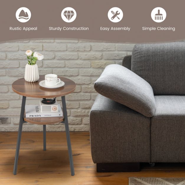 2-Tier Round End Table with Open Shelf and Triangular Metal Frame-Walnut