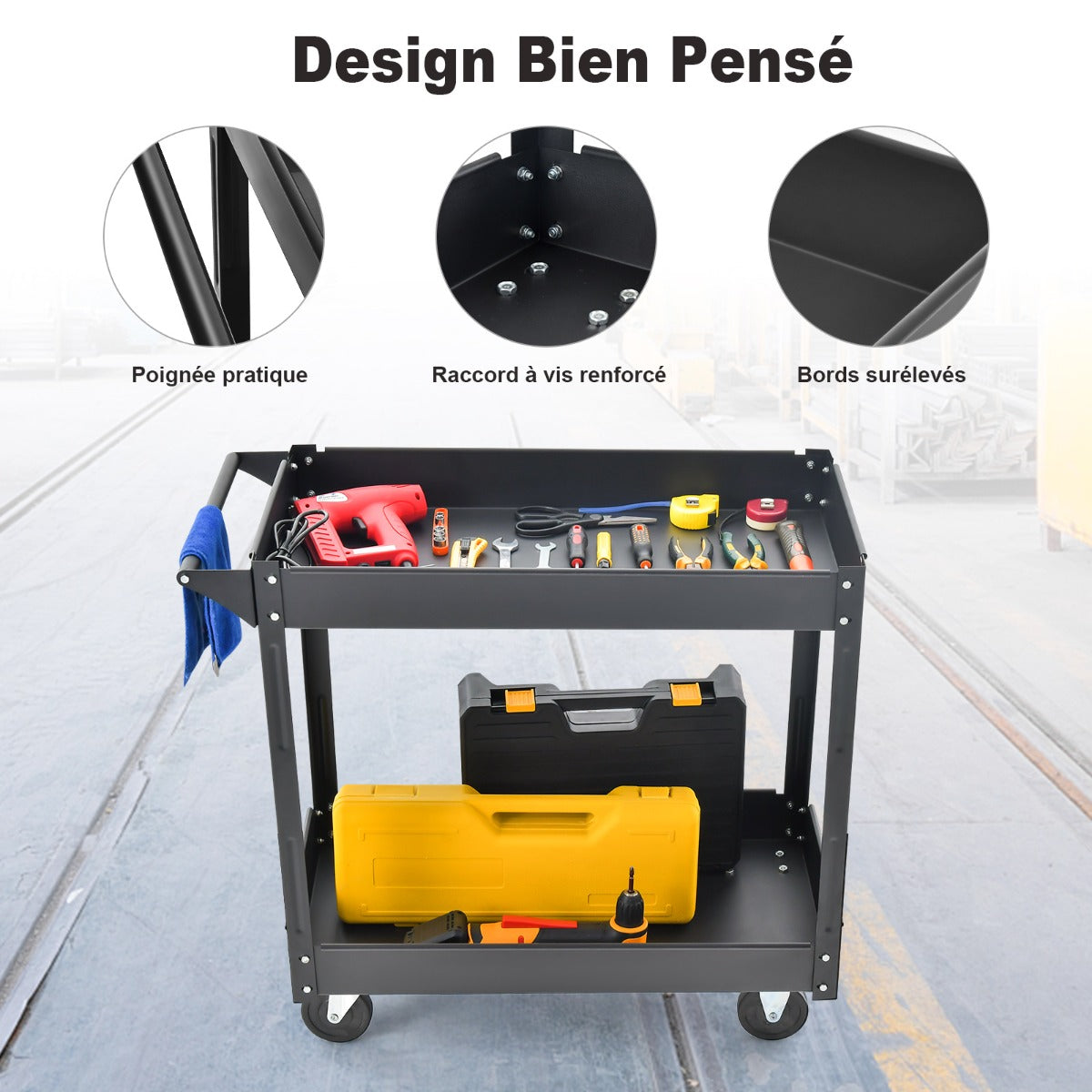 2 Tiers Tool Trolley with Handle and 4 Wheels-Black