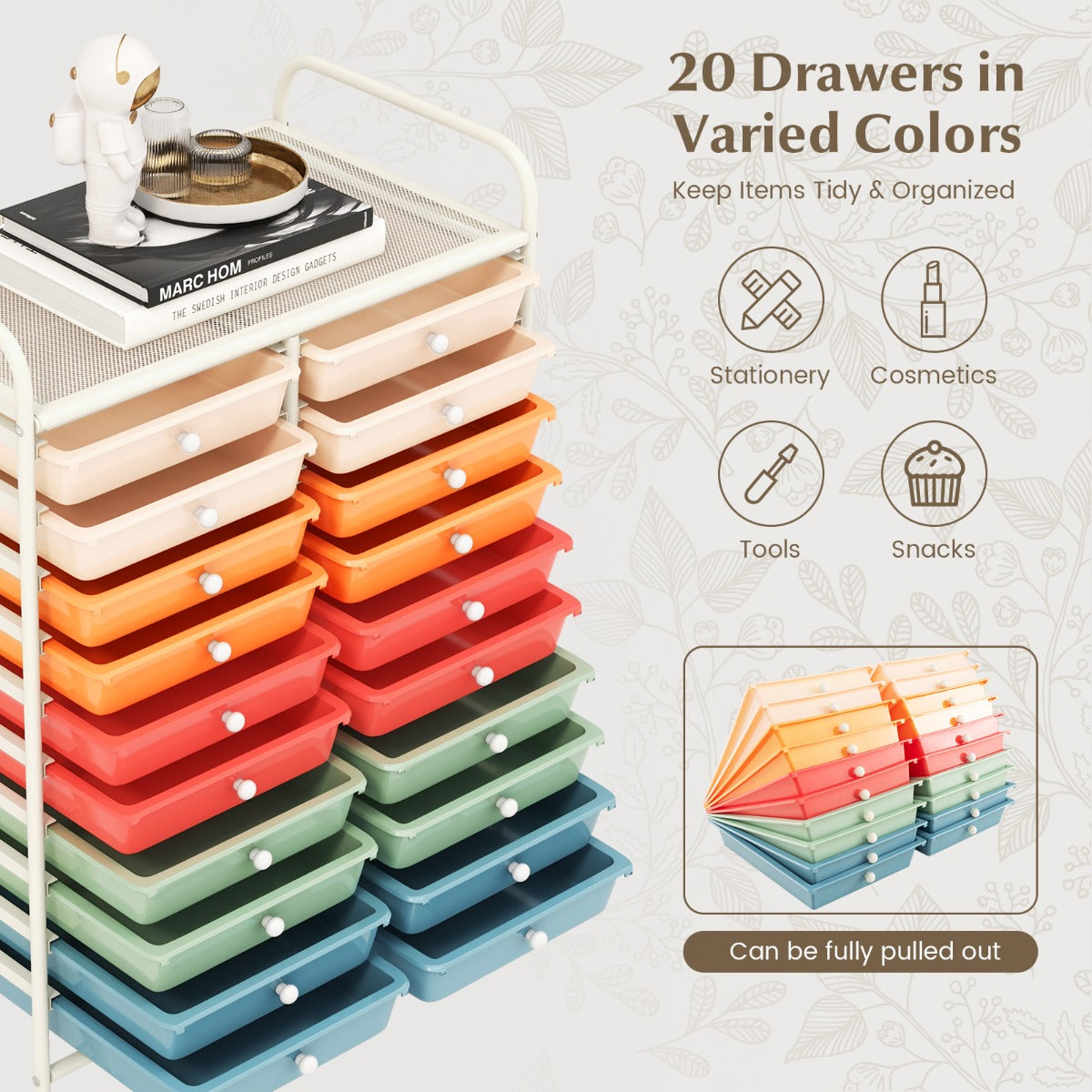 20 Drawers Rolling Storage Cart Studio Organizer-Deep Multicolor