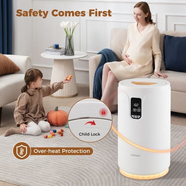 This deluxe 20L towel heater has space to snuggle two oversized towels, blankets, or your cozy bathrobe. Imagine stepping out of the shower and wrapping yourself in blissful warmth, heated to perfection at 50°C/120℉! This user-friendly device boasts a sleek LCD display and easy-touch settings—customize your heat level and timer effortlessly for a tailored warming experience. Safety is paramount with built-in child-lock and overheating protection. And don’t forget the scent! Add your favorite fragrance for an enchanting sensory boost. Don’t wait, transform your daily routine into a luxurious spa retreat today! Get this must-have bathroom luxury now and indulge in warm comfort anytime!Note: Use with dry fabrics only! Bullet Point:20L Spacious Capacity: This 20L towel heater boasts an impressive capacity that can easily fit two 115 x 180cm oversized towels, plus blankets and bathrobes too. Just remember, it’s exclusively for dry fabric, ensuring optimal performance and safety. Rapid and Even Heating: For instant comfort, this amazing towel warmer heats up in a lightning-fast 1 minute and reaches its peak temperature of 130°C in just 5 minutes. And your towel will be a toasty 50°C, perfect for wrapping yourself in pure bliss. User-Friendly Design: The clear LCD display of the hot towel bucket keeps you informed with real-time temperature and remaining time. And with intuitive buttons, you can effortlessly set your desired temperature among 3 temperature levels, choose from 30/60/90 min heating periods, and adjust the delay timer between 0.5 to 24 hours to suit your schedule. Safety Comes First: Safety is a top priority with this blanket warmer. The child-lock function is a game-changer—just give the lid a quick clockwise twist to lock it securely. Plus, the bottom light provides a handy visual cue, shifting from purple to red as the interior temperature rises. Elevate Your Bathing Experience to Spa-Level: Transform your bathroom into a personal sanctuary with this towel warmer. The lid’s built-in fragrance disc tray is a delightful touch, inviting you to add your favorite scent (though fragrant discs aren’t included).