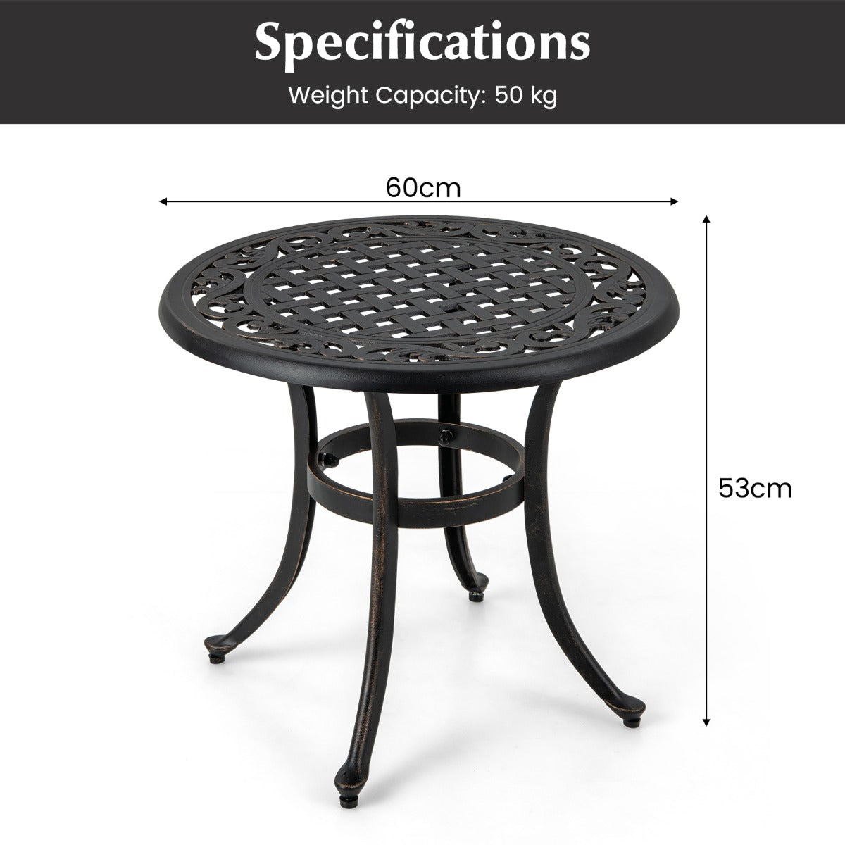 -Premium rustproof cast aluminum construction-Lightweight and easy to carry-Reinforced retaining ring for added stability-Adjustable footpads make the table stand stably-Eye-catching retro design with elegant patterns-Antique brown finish for a vintage look-Suitable for multiple outdoor occasions-Easy and quick assembly instructions provided