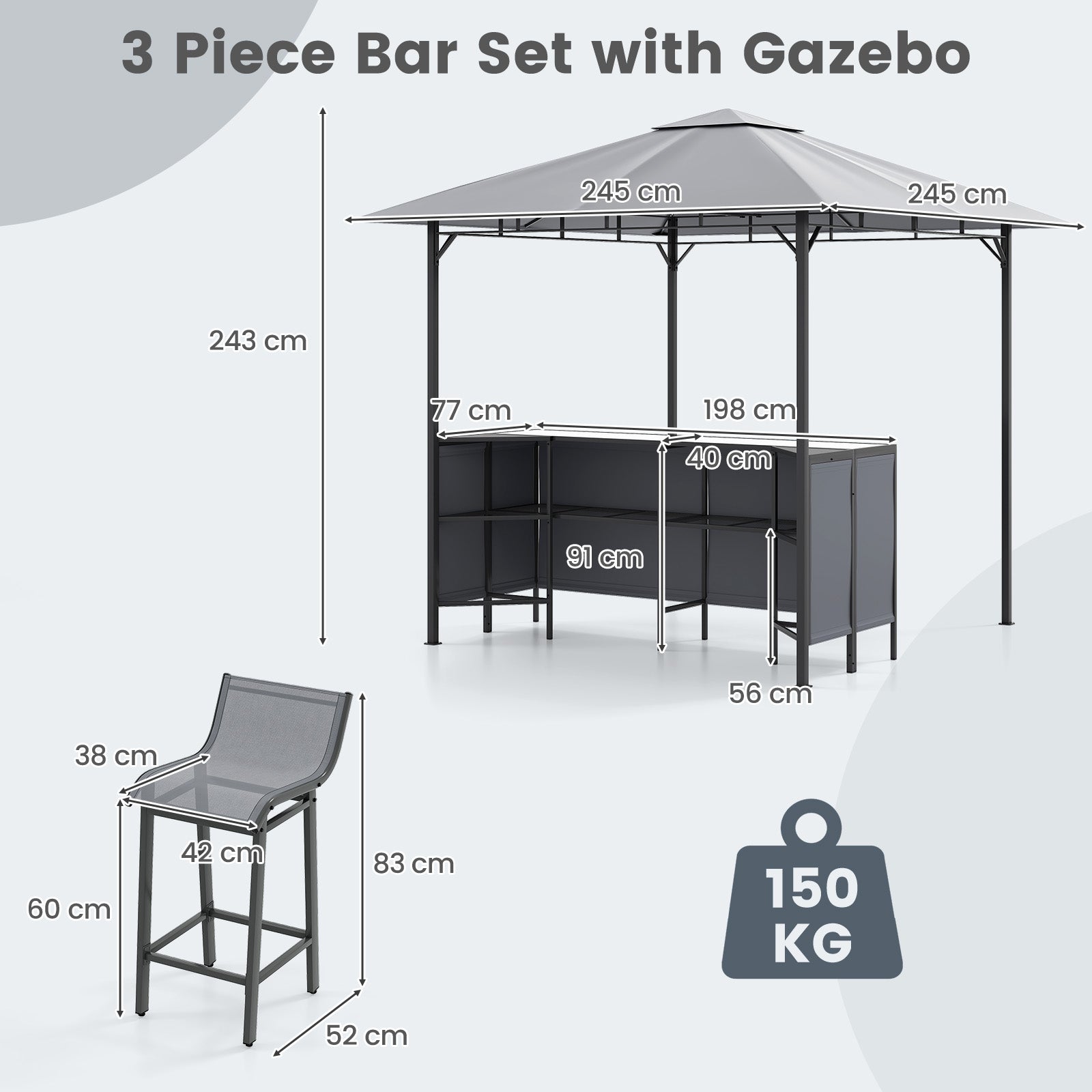 245 x 245 cm 3-Piece Patio Bar Set Grill Gazebo with Bar Stools and Table-Grey