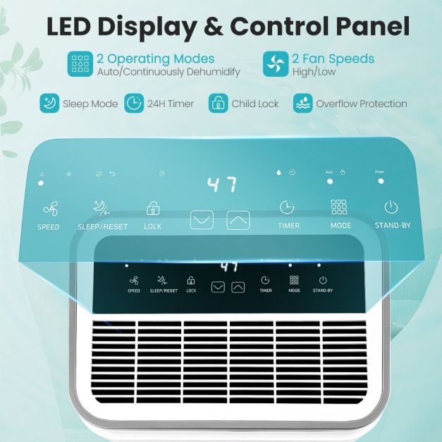 The powerful dehumidifier will be a great addition to your space, offering comfortable and refreshing air. Designed with a control panel and LED display, this dehumidifier is easy to read and use even for the elderly. Also, it is built with a 3-colours indicator light which can show different colours according to the ambient humidity. Besides, this dehumidifier has 2 operating modes and 2 fan speeds, meeting your different needs. You can choose manual drainage or continuous drainage according to your situation and a drainage pipe is included for continuous drainage. Moreover, this unit features sleep mode and a 24H timer. The child lock function is safe for families with kids. The side handles and castors will help you move the unit and this dehumidifier is suitable for many locations like home, office, and more. If you are looking for such a dehumidifier, don't hesitate to place an order! 25L/Day High-Efficiency Dehumidifier: Theportable dehumidifier features 25L/Day dehumidification capacity and the set humidity is adjustable from 30% to 80%, providing dry and comfortable air in the space up to 30 ㎡. With side handles and castors, this mobile dehumidifier is easy to move around, and suitable for home, office, basement and more. Visualized Humidity andLED Control Panel: This dehumidifier for home is designed with a control panel with an LED display, which makes it easy to read and use. In addition, the low-energy dehumidifier equips with a 3-colours indicator light which will show blue (≦45%), green (45%-65%) and red (≧65%) according to the ambient humidity. Manual and Continuous Drainage: The dehumidifier for dampness features 2 operating modes (auto and continuously dehumidifying) and 2 fan speeds (high and low). The auto mode requires manual drainage and the unit will sound a buzzing alarm and shut off automatically when the water tank is full. And the drainage pipe is included for continuous drainage. Humanized andChild-Friendly Designs: The dehumidifier is built with a sleep mode that ensures an ideal sleeping environment. In addition, you can set the 24H timer to shut off or turn on the unit automatically when you need and reduces energy costs. Moreover, parents can open the child lock function when their kids are not under supervision. Create Healthy Environment: The dehumidifier for drying clothes can create a comfortable and healthy environment for you and your family, keeping you away from mouldy walls, mouldy floors, wet clothes, musty smells, respiratory problems and more. Also, the air filter is removable and washable for convenient cleaning.