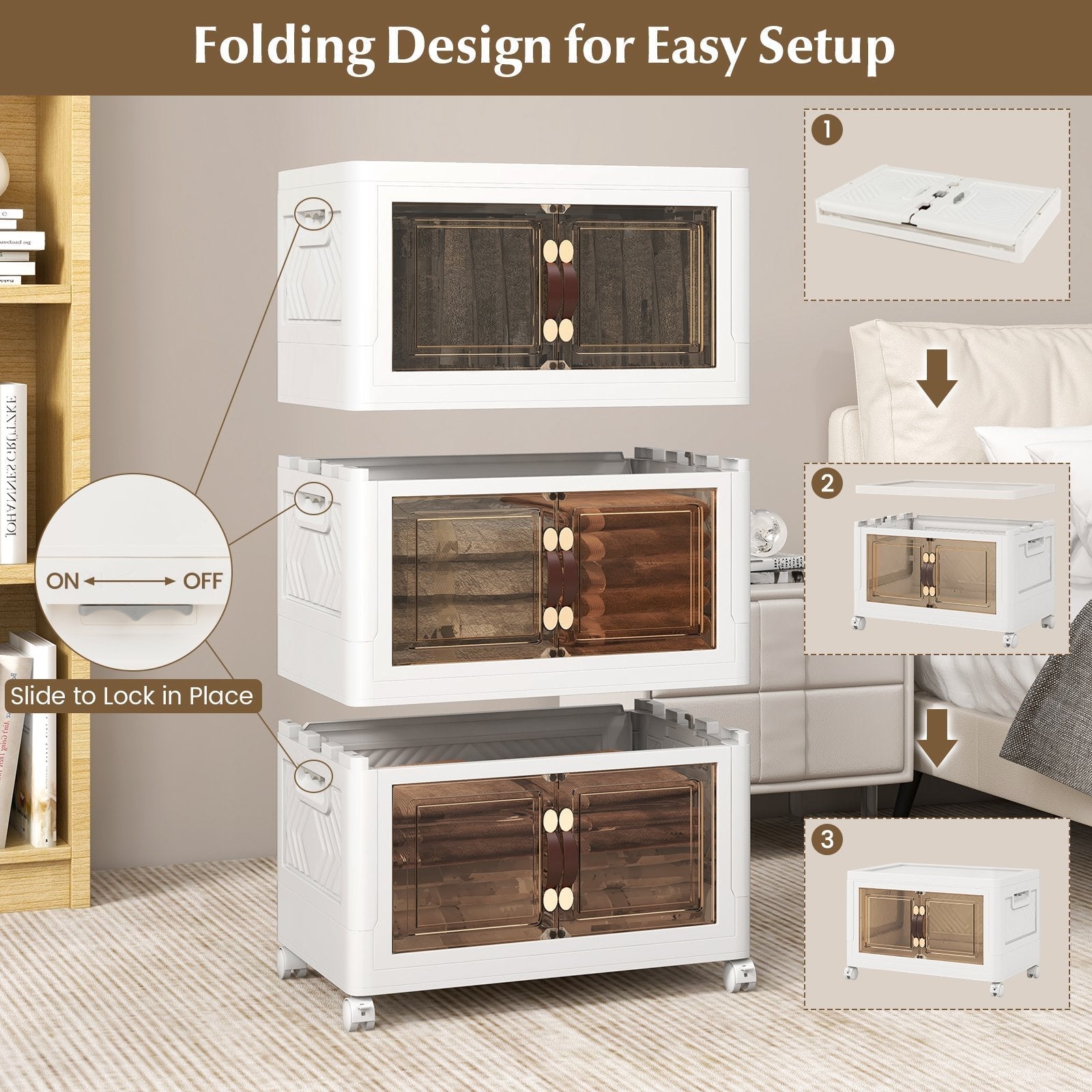 Each stackable storage bin has a large capacity, providing plenty of space for everyday use. Front doors, handles and magnets make accessing items never been easier. The storage box can also be removed and folded to be easily stored under the bed or sofa. Made of reliable PP material, these storage boxes are lightweight and durable. Moreover, they also equipped with 4 lockable wheels for effortless mobility. Versatile storage cabinet can be used as a clothing or toy organizer, shoe locker, snack storage cabinet, or even a tool cabinet. This modern floor storage box is easy to install and requires no tools, making it a great addition to enhance your home's style. Get started on giving your home a new look! Large Capacity Storage Bins: The capacity of each stackable storage bins is 27/34/44/59/78/92.5 gallons. And the large size of the cabinet is enough to meet your daily needs. The front doors come with handles and magnets for easy access. Of course, you can also remove the top panel of the cabinet to quickly access the internal items from above. Free Stacking and Folding Design: The organizer consists of 3 practical PP bins, which can be freely stacked or dismantled with the side locking design. In addition, you can also detach and fold each box when not in use. Single storage box is compact sized when folded, so it can easily fit under the bed or sofa. Reliable Material and Lockable Universal Wheels: Made of reliable PP material, this storage boxes are more reliable than fabric storage boxes and lighter than wooden or metal organizers. The storage box comes with 4 wheels, 2 of which are lockable. So you can easily fix or move it whenever you like. Suitable for Various Scenarios: Not only is it a clothing organizer, but it is also a shoe cabinet in the entrance, a toy organizer in the children's room, a snack cabinet in the living room or a tool cabinet in the garage. Besides, it's worth mentioning that all the materials of the storage cabinet are BPA-free, so you can absolutely place mother and infant supplies in it directly. Easy Installation Without Tools: You can easily complete the installation without any tools! All you need to do is simply unfold each layer of the organizer, put them together, and finally install the top and wheels. Detailed instruction manual will be included. There is no doubt that this modern floor storage bins make your home decoration more stylish.