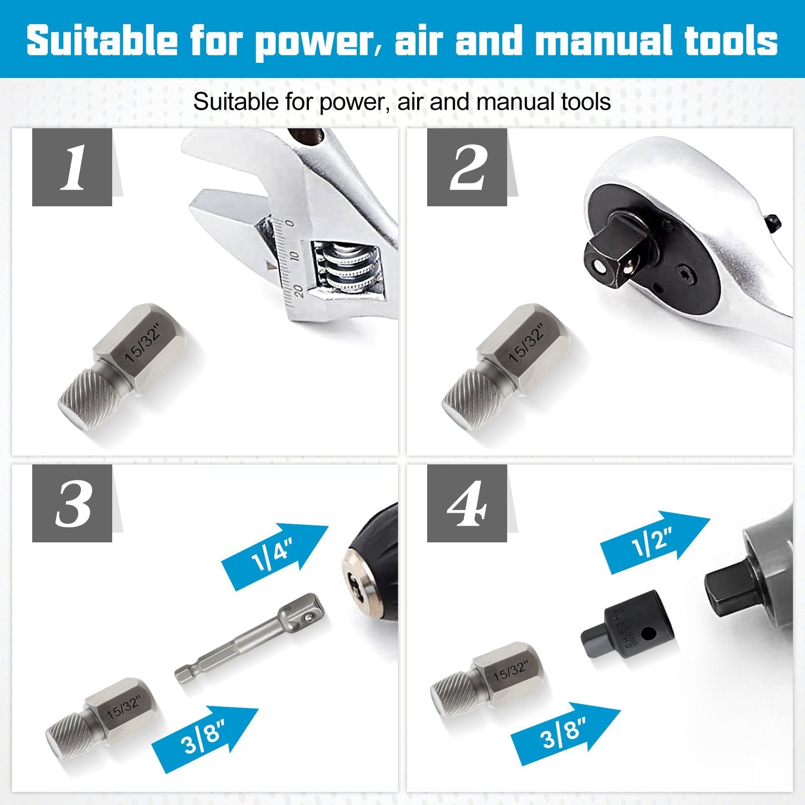 The screw extractor set includes 2 adapters and 25 extractors, ranging from 1/8" to 7/8" in 1/32" increments, all stored in a HDPE case. This versatile kit, engineered for the effortless removal of stripped, frozen, and damaged screws, is particularly beneficial in applications such as automobile repair, house renovation, and machinery installation. The innovative 3/8" square drive design offers flexible connection options, simplifying its use with a ratchet wrench. The multi-spline design, coupled with a reversed spiral, maximizes grip while minimizing user effort. Constructed from heat-treated Cr-Mo steel, this set is built to endure harsh use and withstand tough conditions. Upgraded Connection: This dual-headed screw extractor kit features a standard 3/8” square drive for compatibility. It differs from traditional screw extractors by allowing direct attachment to a wrench, eliminating the need for intermediary connecting sleeves. Wide Applications: The 27 pcs screw removal kit includes a 3/8” to 1/2” adapter and a 1/4” to 3/8” adapter with a 65 mm extension, ensuring its compatibility with a broad range of power, pneumatic, and manual tools. The set facilitates the efficient extraction of stripped, frozen, rusted, or damaged screws and studs. Premium Quality: Each bolt extractor is crafted from chromium-molybdenum steel, renowned for its hardness and strength. The undergone heat treatment process increased its rust resistance for use in rough conditions, and the laser-etched markings remain legible over time. Easy to Use and Store: The multi-spline screw extractors feature left-hand spirals, enhancing its grip with added strength. Furthermore, the kit is neatly arranged in a HDPE case, which not only protects the extractors but also keeps them easy to find. The Right Size: Select the right size for the specific conditions. Available diameters: 1/8", 5/32", 3/16", 7/32", 1/4", 9/32", 5/16", 11/32", 3/8", 13/32", 7/16", 15/32", 1/2",17/32", 9/16", 19/32", 5/8", 21/32", 11/16", 23/32", 3/4", 25/32", 13/16", 27/32", and 7/8".