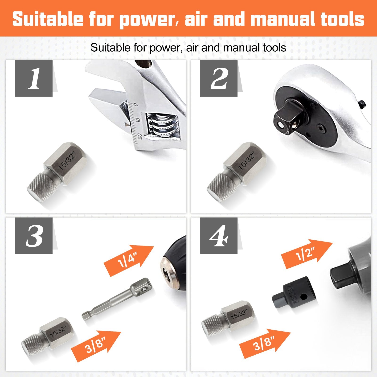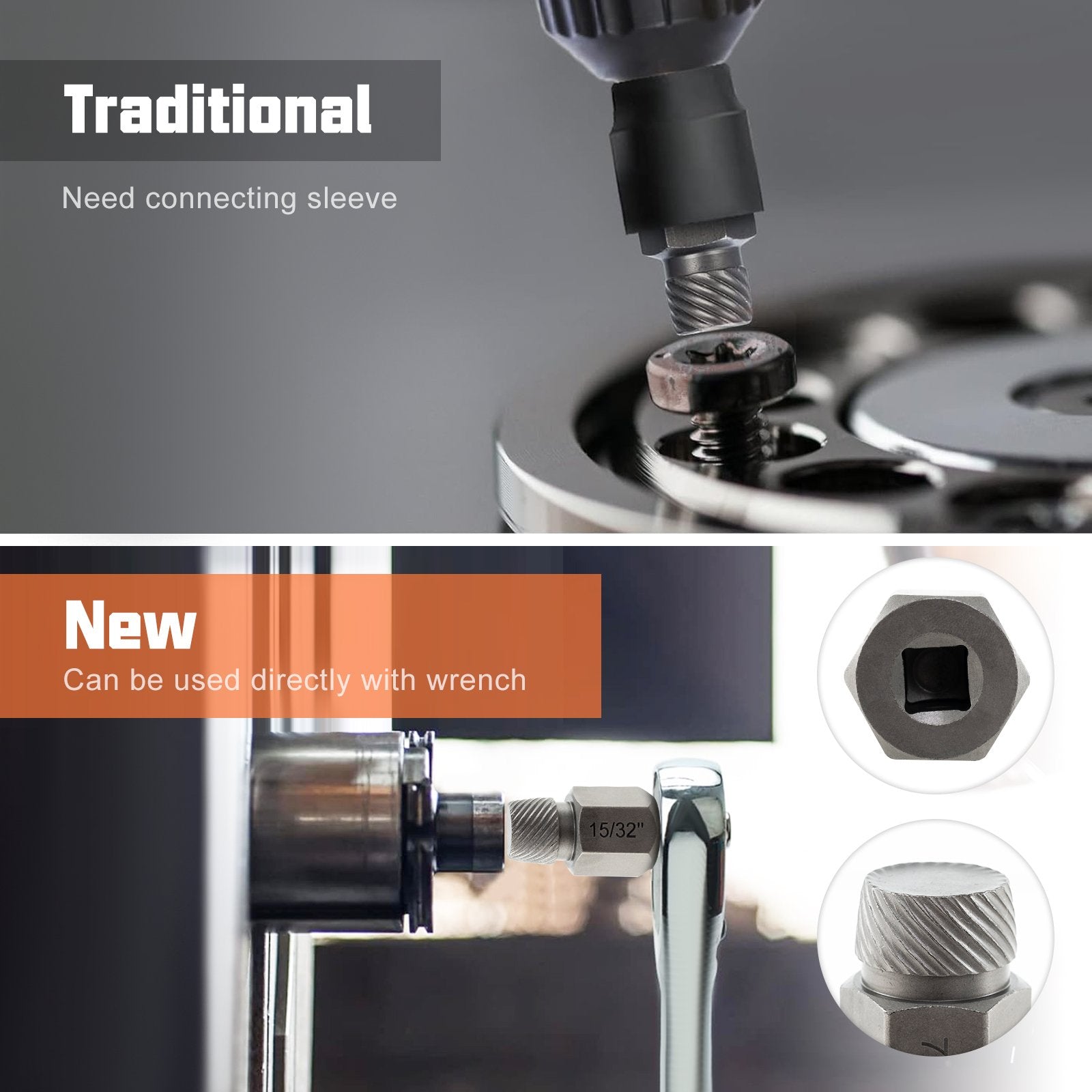 The screw extractor set includes 2 adapters and 25 extractors, ranging from 1/8" to 7/8" in 1/32" increments, all stored in a HDPE case. This versatile kit, engineered for the effortless removal of stripped, frozen, and damaged screws, is particularly beneficial in applications such as automobile repair, house renovation, and machinery installation. The innovative 3/8" square drive design offers flexible connection options, simplifying its use with a ratchet wrench. The multi-spline design, coupled with a reversed spiral, maximizes grip while minimizing user effort. Constructed from heat-treated Cr-Mo steel, this set is built to endure harsh use and withstand tough conditions. Upgraded Connection: This dual-headed screw extractor kit features a standard 3/8” square drive for compatibility. It differs from traditional screw extractors by allowing direct attachment to a wrench, eliminating the need for intermediary connecting sleeves. Wide Applications: The 27 pcs screw removal kit includes a 3/8” to 1/2” adapter and a 1/4” to 3/8” adapter with a 65 mm extension, ensuring its compatibility with a broad range of power, pneumatic, and manual tools. The set facilitates the efficient extraction of stripped, frozen, rusted, or damaged screws and studs. Premium Quality: Each bolt extractor is crafted from chromium-molybdenum steel, renowned for its hardness and strength. The undergone heat treatment process increased its rust resistance for use in rough conditions, and the laser-etched markings remain legible over time. Easy to Use and Store: The multi-spline screw extractors feature left-hand spirals, enhancing its grip with added strength. Furthermore, the kit is neatly arranged in a HDPE case, which not only protects the extractors but also keeps them easy to find. The Right Size: Select the right size for the specific conditions. Available diameters: 1/8", 5/32", 3/16", 7/32", 1/4", 9/32", 5/16", 11/32", 3/8", 13/32", 7/16", 15/32", 1/2",17/32", 9/16", 19/32", 5/8", 21/32", 11/16", 23/32", 3/4", 25/32", 13/16", 27/32", and 7/8".