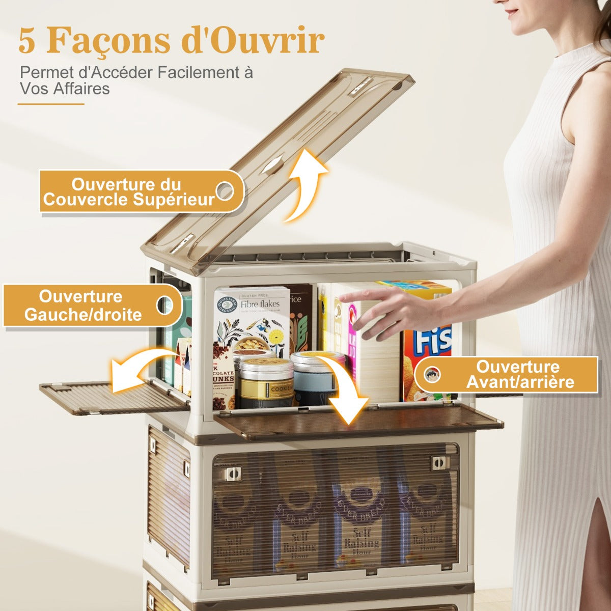Effortlessly organize your space with the stackable storage bins. With a large storage capacity, these bins are perfect for storing clothes, toys, books, snacks, and more. The 5 opening ways design also allow you conveniently fetch your belongings from multiple directions. Each storage box is equipped with wheels on the bottom, allowing for easy mobility and standalone use. It also features a collapsible design that not only saves space but also makes installation a breeze. Moreover, the embedded receptacles for desiccant or insect repellent provide added protection for your belongings. Upgrade your storage solutions with these versatile and practical storage containers! Five Opening Ways: Featuring top lids and convenient flap-down doors on all four sides, our stackable storage bins offer 5 opening options for easy access from multiple angles . Moreover, door latches on all sides provide added security for your belongings. Stackable and Movable Design: These plastic storage boxes with lids feature grooves on the top that align with wheels, allowing for easy and secure stacking. With wheels on the bottom, these storage bins can be effortlessly rolled on hard surfaces and utilized as individual units. Foldable Design and Easy Setup: No tools are required for assembly, and you can simply unfold and set up the bins in seconds. When not in use, the storage containers can be folded down for compact storage, saving valuable space in your home. Multipurpose Storage: Boasting a spacious capacity of 292 L, our plastic bins are ideal for storing clothes, books, snacks, and more. These versatile containers offer efficient organization solutions for your living rooms, closets, bathrooms, kitchens, and are also suitable for car trunks when camping. Translucent Visibility: The semi-transparent design of our collapsible storage bins with lids allows you to easily see the contents without having to remove the lids. This makes it effortlessly to locate and retrieve items from any angle.