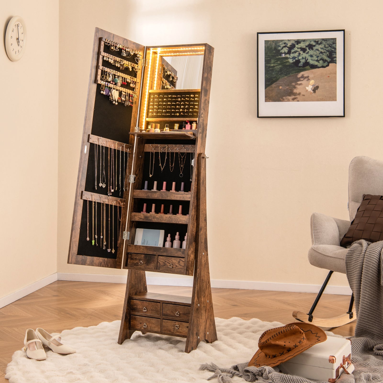 Inside the cabinet, there are 72 earring slots and 24 holes, 30 necklace and bracelet hooks, 72 ring slots, 3 storage shelves and 2 drawers to keep various items well organized and easy to access. And the soft velvet lining helps protect your jewelry. But that's not all! The jewelry cabinet features a bottom shelf and 4 drawers to offer more room for your belongings. 3 holes on each side of the stand allow you to adjust the most suitable angle according to your needs, ensuring a perfect view every time. Moreover, the jewelry armoire also comes with a small makeup mirror and a foldable storage shelf to add convenience and functionality to your daily routine. More importantly, the built-in LED light strip can illuminate your treasures and make it easier to choose the perfect piece. Large Storage Capacity: The freestanding jewelry organizer has 72 earring slots and 24 holes, 30 necklace and bracelet hooks, 72 ring slots, 3 storage shelves, and 2 drawers to store and organize your jewelry and cosmetics. Meanwhile, the bottom shelf and 4 drawers offer extra storage space for your bags, shoes or sundries. Full-length Mirror and 3 Tilt Angles: The jewelry armoire features a frameless and clear full-length mirror for you to see yourself from head to toe. In addition, 3 adjustable tilt angles (106°/102°/98°) allow you to choose the most suitable angle to get a better view. Adjustable Lights and Built-in Mirror: The built-in makeup mirror and 3-color LED light strip make it convenient for you to choose jewelry or apply makeup even in the dark. You can press the light switch to change the light color from yellow light to white light or blue light. The light is powered by 3 x AA 1.5V batteries (not included). Plus, the foldable shelf holds your cosmetics or brushes. Built to Last and User-friendly Design: Made of high grade material and built with a stable base, the jewelry storage cabinet is not easy to wobble and remain steady. Moreover, the magnetic door catch keeps the cabinet door tightly closed and the premium metal hinges ensure long-lasting use. Easy Assembly and Elegant Charm: With the easy-to-understand instruction, you can install the jewelry cabinet in a short time. Additionally, the jewelry cabinet with full-length mirror will bring both convenience and style to any bedroom, powder room, or cloakroom.