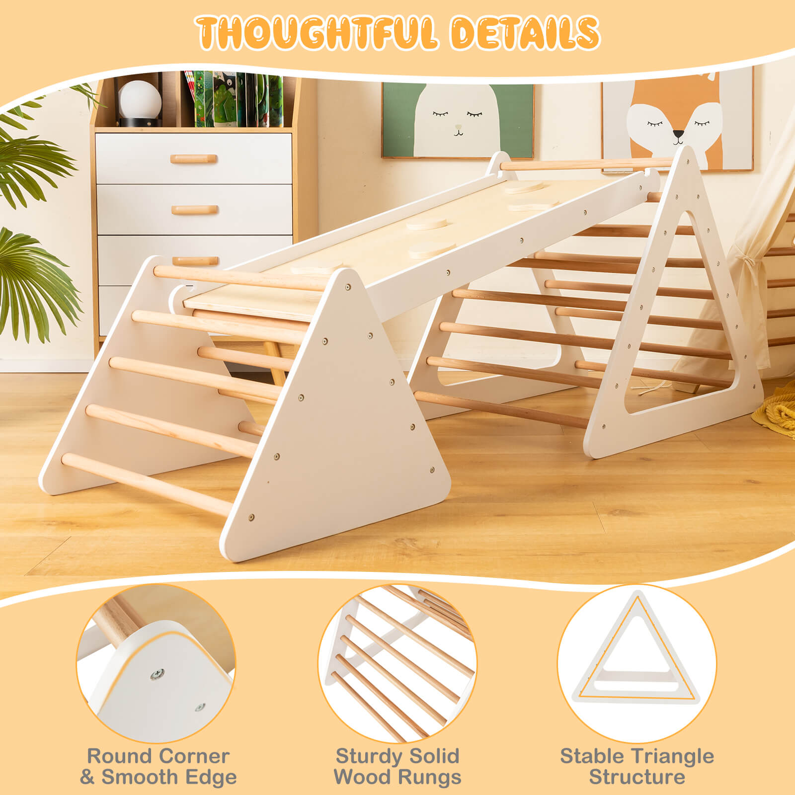 This toddler playground consists of 1 big triangle ladder, 1 small triangle ladder and 1 ramp. The ramp has 2 sides: one side with stones for climbing and another side with a smooth surface for sliding. The 3 pieces of this climbing toy set can be used in different combinations to offer more fun to your little ones. As for quality, made of natural solid wood and supported by a triangle structure, the climbing ladder is very stable, and durable and won't easily topple over. Thanks to the round corners, smooth edges and child-friendly paint, children will have a safe play on this climbing toy set. What's more, you can tuck the small triangle ladder into the big one to easily store and save space. If you are looking for such a product, do not hesitate to buy it! 3-in-1 Toddler Climbing Toy: This 3-piece kids' climbing toy set comes with 2 triangle ladders of different sizes and 1 reversible ramp for climbing and sliding, offering multiple ways for children to play while developing their balance control, motor skills and courage. Besides, the ramp can be tilted at different angles to meet various needs. Stable Solid Wood Construction: Crafted from natural pine wood and birch wood, this toddler climbing ladder playset is stable and durable enough to support long-lasting use and can hold up to 60kg. In addition, the stable triangular structure and firm connection between each part provide added stability to avoid toppling over. Safe Design and Exquisite Workmanship: With excellent craftsmanship, the corners and edges of this 3-piece triangle ladder and ramp set are rounded and free of burrs, which can prevent toddlers from accidentally bumping or scratching. Besides, the surface with child-friendly paint is odorless and won't harm kids' health. Wide Application and Easy Storage: The 3 parts of this climbing set can be used together or separately, offering more ways to play for children of different ages. And children can play it in the playroom, living room or outdoor space. Moreover, the smaller triangle ladder can be tucked into the bigger one for convenient storage and saving space. Easy to Assemble and Clean: Coming with detailed instructions and complete accessories, it is easy and quick to assemble the climbing ladder set. What's more, the painted surface of this ladder and ramp is smooth and waterproof, making it easy for you to clean with a damp cloth.