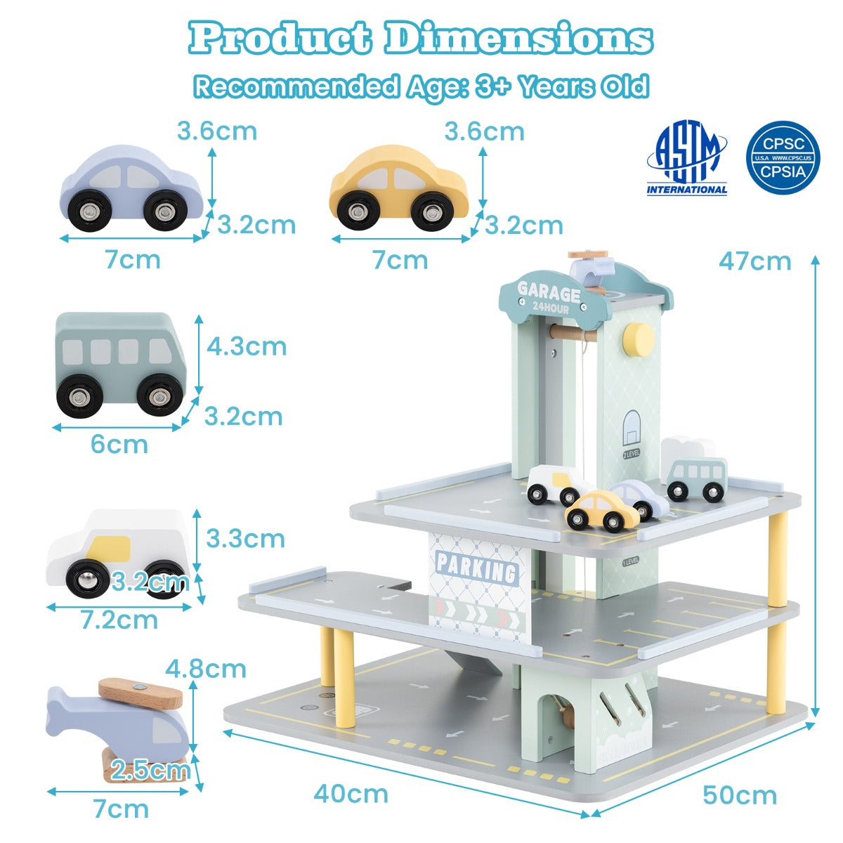 The toy garageincludes 4 colorful cars, a helicopter, an elevator, a helipad, a car wash, and a gas station. Each element is crafted from high-quality wood with smooth, rounded edges for safe play. Let your child park the helicopter, fuel up the car, push the car in the elevator, downhillto the ground floor and drive through the lift rod for endless fun! Ideal for fosteringcolor recognition,imagination and creativity, this playset is aperfect educational tool withEN71and REACH compliant. Gift your child the joy of imaginative play with this comprehensive and educational parking garage playset. Comprehensive Playset: This 3-layer parking garage playsetisfull of features for endless fun, complete with 4 colorful cars and a helicopter. The combination ofelevator, helipad, gas station, car wash, slope and lift rodencourageshours of imaginative play. Premium Wood Material: Crafted fromreliable and healthywood material, this 3-layer garage playset is built to lastand can withstand the enthusiastic play of young children. Moreover, thesmooth and rounded edge will prevent kids from stitches, and the accessories of suitable size avoid accidental swallowing. Interactive Features: Enhanceyour child’s playtime experience with interactive elements such as a fun-to-operateelevatorand a lift rod. These features are not only fun but also perfect for thedevelopment of hand-eye coordinationand hand-on ability. Enhanced Creative Play: Thehelicopter andthe top helipad included in the setwill bring more fun. And theadditionof car wash and gas station alsopromotes the imagination and creativity of your little one. Ideal Educational Toy: This parking garage playset is not just a toy, but a valuable educational tool thatpromotes kids’all-round development. The playset complies with EN71and REACH, making it an ideal gift choice for kids.