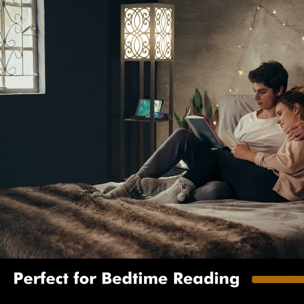 With its vertical shape, this standing lamp is suitable for the corner of your living room and bedroom. If your electric devices run out of the battery, 2 USB ports will provide effective assistance. Apart from this, the pull-switch chain avoids you bending over to turn off the light for coziness. In addition, this floor lamp is also compatible with the role of bookshelf due to its 1 practical drawer and 3 open shelves. Built-in Power Station: This shelf floor lamp features two 5V/2A USB ports, which allows you to charge 2 devices at once for great convenience. Therefore, you are able to charge your mobile phone and tablet with ease. Meanwhile, the indentation keeps your phone or tablet in position. Ample Storage Space: Equipped with 1 practical drawer with convenient handle and 3 open shelves, this standing floor lamp brings roomy storage to accommodate different items, such as remote control, photo frames and magazines, keeping your space tidy and clean. Besides, the wire storage clamp reduces clutter as well. Elegant Floor Lamp: This floor lamp combines white lamp shade and elegant wood grain as one that makes a timeless addition to your home decoration. Hence, no matter if you want to place it in the living room or bedroom, it will always fit because of its wide application. User-friendly Design: You can turn on/off light conveniently because this display standing lamp is designed with a pull-switch chain. Moreover, the high quality MDF as well as the anti-slip foot pads ensure the strong construction to this floor lamp. And the smooth surface allows you to clean it without hassle. Simple Installation: The detailed instruction and necessary accessories will help you to assemble this tall lamp quickly. The E27 standard base makes this floor lamp fit LED bulb, incandescent bulb and CFL bulb (not included). Please note that the minimum compatible wattage is 9W and the maximum is 40W.