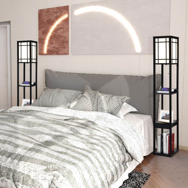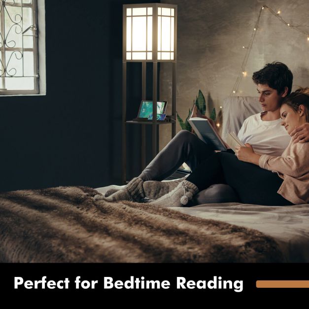 With its vertical shape, this standing lamp is suitable for the corner of your living room and bedroom. If your electric devices run out of the battery, 2 USB ports will provide effective assistance. Apart from this, the pull-switch chain avoids you bending over to turn off the light for coziness. In addition, this floor lamp is also compatible with the role of bookshelf due to its 1 practical drawer and 3 open shelves. Built-in Power Station: This shelf floor lamp features two 5V/2A USB ports, which allows you to charge 2 devices at once for great convenience. Therefore, you are able to charge your mobile phone and tablet with ease. Meanwhile, the indentation keeps your phone or tablet in position. Ample Storage Space: Equipped with 1 practical drawer with convenient handle and 3 open shelves, this standing floor lamp brings roomy storage to accommodate different items, such as remote control, photo frames and magazines, keeping your space tidy and clean. Besides, the wire storage clamp reduces clutter as well. Elegant Floor Lamp: This floor lamp combines white lamp shade and elegant wood grain as one that makes a timeless addition to your home decoration. Hence, no matter if you want to place it in the living room or bedroom, it will always fit because of its wide application. User-friendly Design: You can turn on/off light conveniently because this display standing lamp is designed with a pull-switch chain. Moreover, the high quality MDF as well as the anti-slip foot pads ensure the strong construction to this floor lamp. And the smooth surface allows you to clean it without hassle. Simple Installation: The detailed instruction and necessary accessories will help you to assemble this tall lamp quickly. The E27 standard base makes this floor lamp fit LED bulb, incandescent bulb and CFL bulb (not included). Please note that the minimum compatible wattage is 9W and the maximum is 40W.
