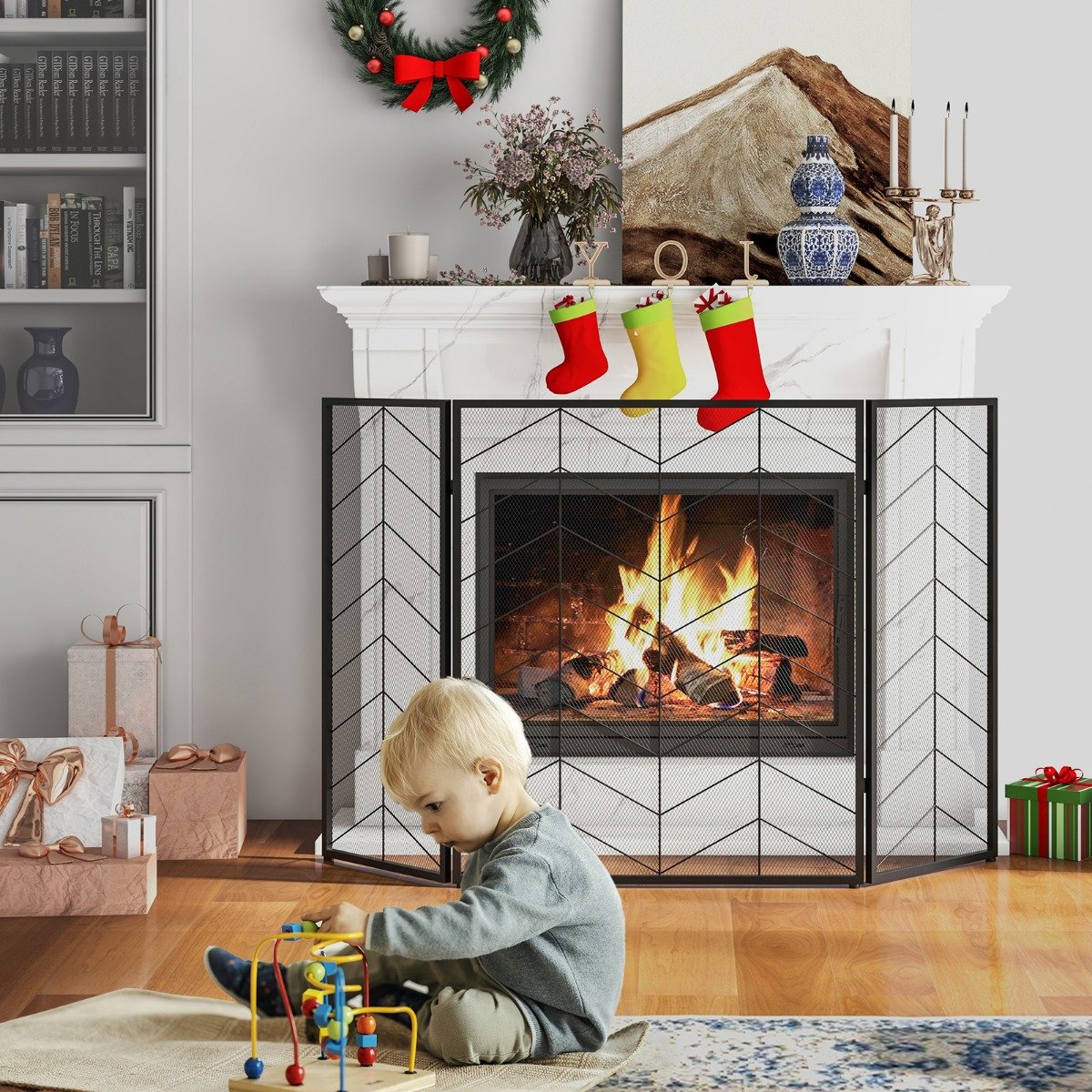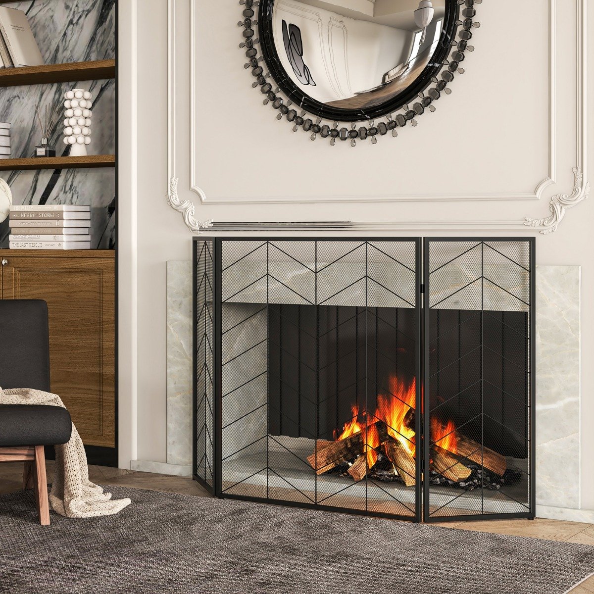 This fireplace screen allows you to relax with warmness and safety. The fireplace screen measures 52" x 31" and features a high-density metal mesh that effectively blocks sparks and ashes, ensuring the safety of kids, pets, and furniture. Made of premium metal, the main frame is rustproof, solid, and can withstand the extreme heat near the fireplace. The decorative herringbone patterns on the 3 panels add an attractive touch to your home decor. Plus, with 3-panel foldable design, this fire guard is easy to store and carry. All in all, this fireplace screen combines functionality with aesthetic appeal, making it an ideal addition to any indoor occasions. Considerate Protection: The fireplace screen with high-density metal mesh can effectively protect your kids, pets and furniture. Therefore, you can enjoy warmth without scorching sparks and ashes. 3-Panel Foldable Design: Designed with a durable metal hinge between each panel, fireplace fence can be quickly folded or expanded, which is space-saving to store and effortless to carry. Reinforced Metal Frame: The whole fireplace guard is made of premium metal, which is anti-rust, anti-deformation and heat resistant. And thus, it's perfect for long-time use near the fireplace which is extremely hot. Plus, the anti-slip footpads avoid scratches to the floor. Decorative Home Addition: The herringbone-shaped frames on all the 3 panels make the fireplace screen quite eye-catching. This functional fireplace screen with attractive look will be a nice addition to your home. No Assembly Need: The fireplace screen requires no assembly when arriving. You just need to take it out and expand it for direct use.