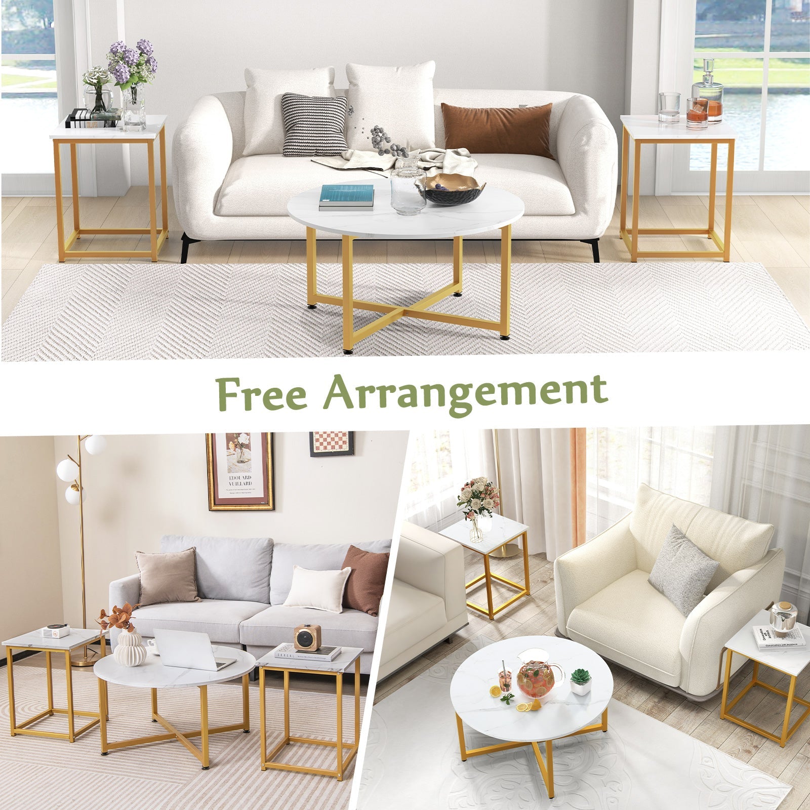 Crafted with a heavy-duty metal frame and high-quality thickened tabletop, these tables exude durability and grace. The robust double cross structure ensures long-lasting resilience, while adjustable foot pads offer supreme stability. Available in 3 captivating color options, these tables feature versatile use, providing ample surface space for drinks, snacks, and decorative items. Arrange them together for a cohesive look, or separate them to suit your space. Elevate your decoration plan today! If you are looking for a 3-piece coffee table set like this, do not hesitate to place an order! Versatile Modern Design: This 3-piece coffee table set offers various styling options with a round coffee table and 2 square side tables, available in 3 different color options. Choose the style that perfectly complements your living space. Heavy-duty Rustproof Metal Frame: The coffee table features a robust powder-coated with X-shaped reinforced structure for added durability and sturdiness. It is further enhanced by adjustable foot pads for extra stability. Ample Surface Space: The living room table set with spacious tabletop provides ample surface space for you to place drinks, snacks, remote controls, and decorative items. Enjoy convenience without compromising on style. Free Arrangement Fits Your Space: With its stylish and versatile design, this side tables effortlessly blend in with different decor styles, elevating the overall aesthetics. You can freely arrange these tables, place them together or separately to fit the space. Easy Assembly and Maintenance: Setting up this accent table set is a breeze with the included instructions and hardware. Additionally, the smooth surface of the tables ensures easy cleaning and low maintenance.