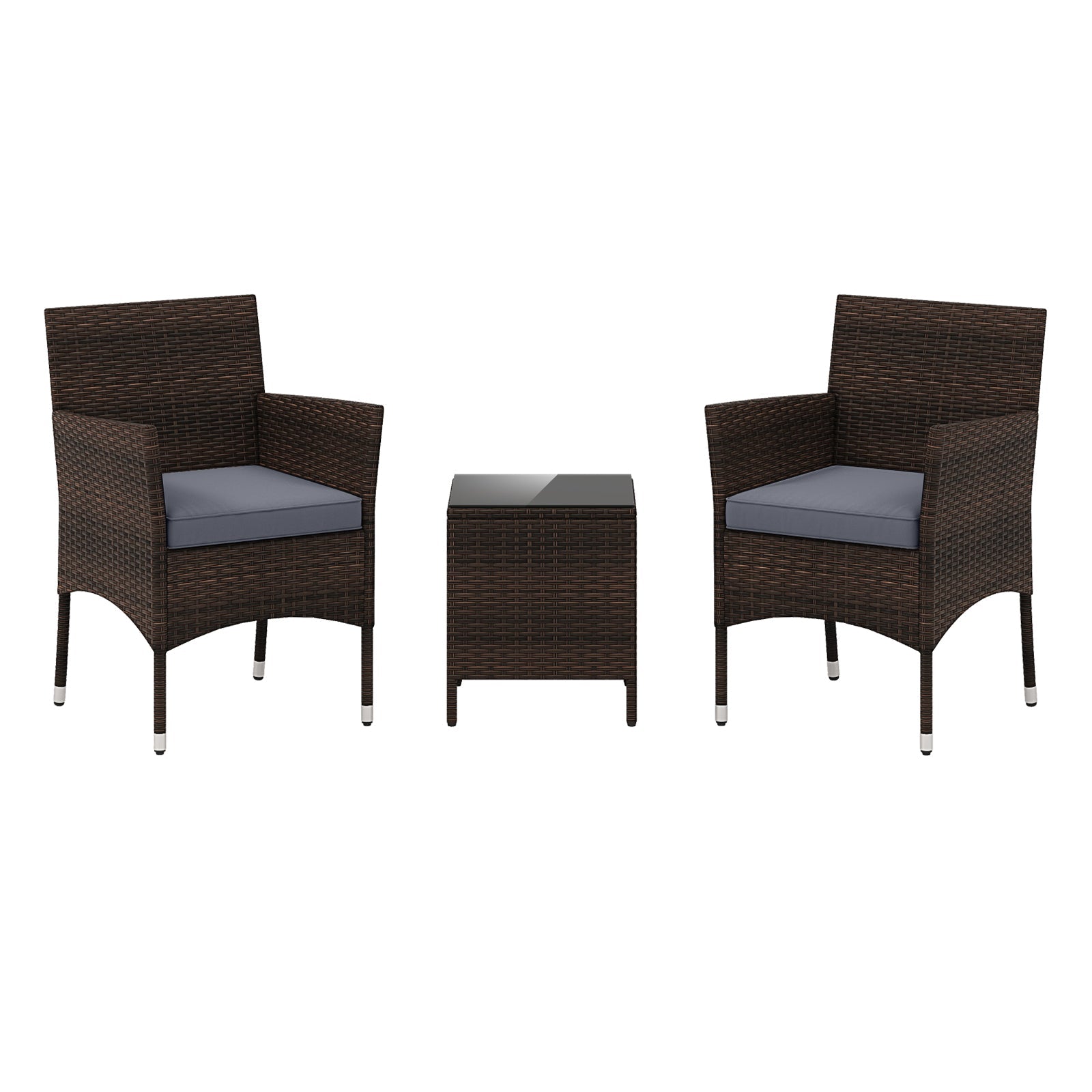 Made from finely woven PE rattan, this outdoor furniture set seamlessly blends durability with appealing aesthetics. The soft seat cushions, filled with high-density sponge, ensure a comfortable and relaxing sitting experience. Maintenance is made simple with the smooth zippers. The included coffee table provides convenient storage for outdoor necessities, featuring suction cups that prevent the tempered glass top from slipping. Supported by a sturdy metal frame, this patio bistro set boasts stability. Additionally, the adjustable foot pads effortlessly accommodate uneven grounds, making this outdoor conversation set an ideal complement for patios, gardens, porches, poolside areas, and more. Selected PE Rattan: Crafted from mix brown PE rattan, the patio conversation set infuses a touch of natural beauty to your outdoor space. The hand-woven rattan is breathable, colorfast and sunproof, ensuring its longevity for years to come. Comfortable Seating: Thanks to the soft seat cushions, you are able to experience unparalleled comfort with this outdoor furniture set. Each cushion is equipped with a convenient zipper, making it effortless to remove for cleaning. Robust Construction: Built on a sturdy metal frame, the patio bistro set promises outstanding durability and stability. The adjustable foot pads allow for perfect placement on uneven surfaces, enhancing safety and steadiness. Functional Coffee Table: This patio furniture set comes with a stylish tempered glass top coffee table, providing a storage solution for your drinks, snacks, or favorite books, keeping everything you need within easy reach. Ideal Outdoor Choice: Each chair features ergonomic backrests and armrests that elevate the comfort level for extended periods of sitting. This outdoor conversation set is versatile enough for porches, gardens, or any outdoor setting.